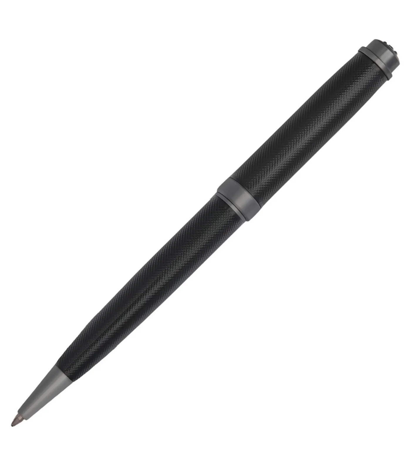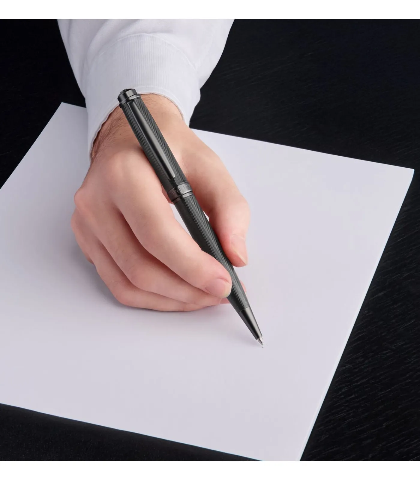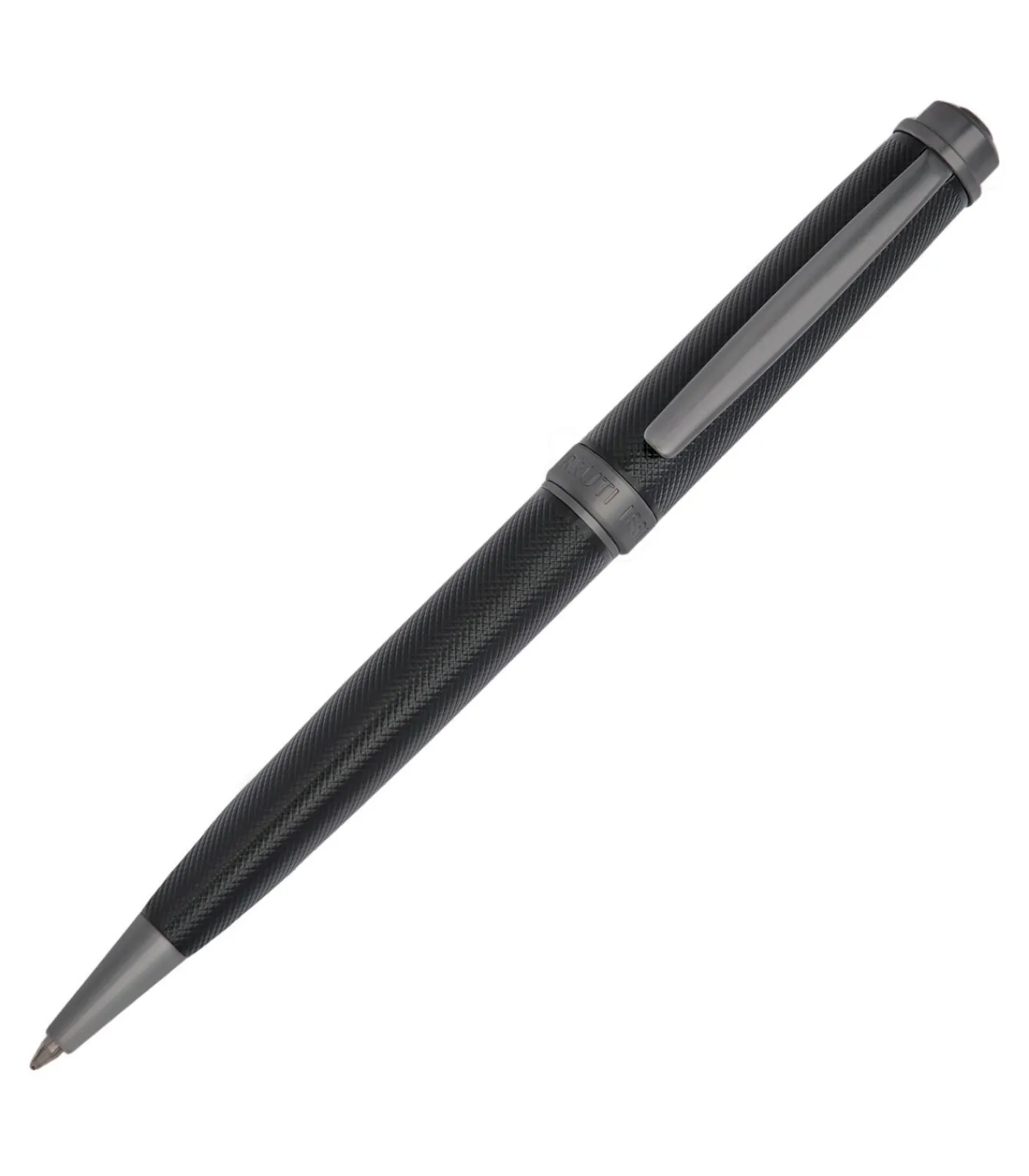 De Belgravia balpen is een uitdrukking van Cerruti 1881’s pure luxe, met zijn matzwarte body met een fijn gegraveerd oppervlak. Moderne matte gunmetal afwerking complementeert het ontwerp, terwijl het iconische CRR logo in een prachtige 3D uitvoering de bovenkant bekroont. Luxueus ingetogen en tijdloos modern, het is een verfijnd schrijfinstrument voor alledaagse elegantie. Dimensions: DIA.13/H.142 mm, Material: Brass,Lacquer, Gun plating
