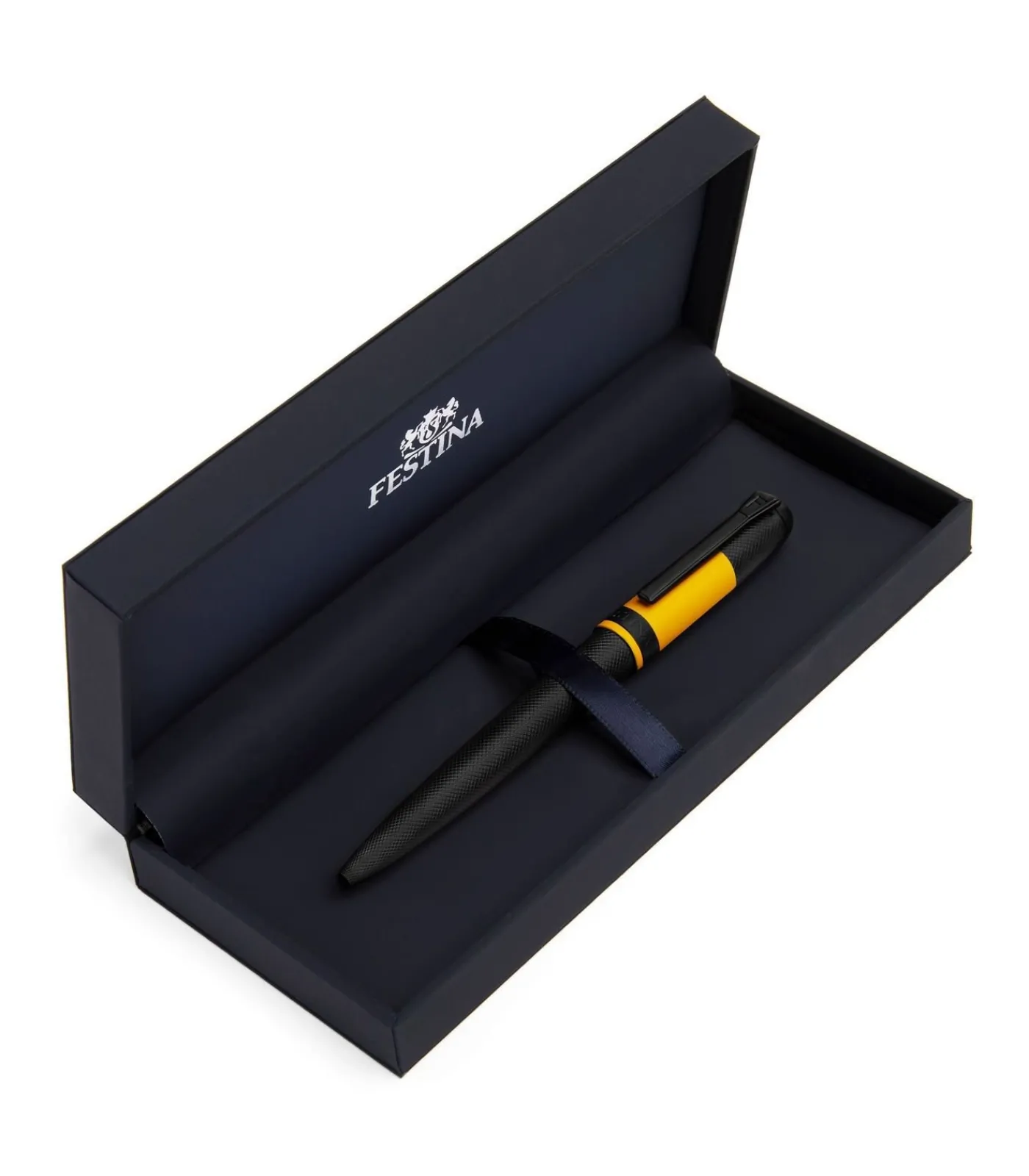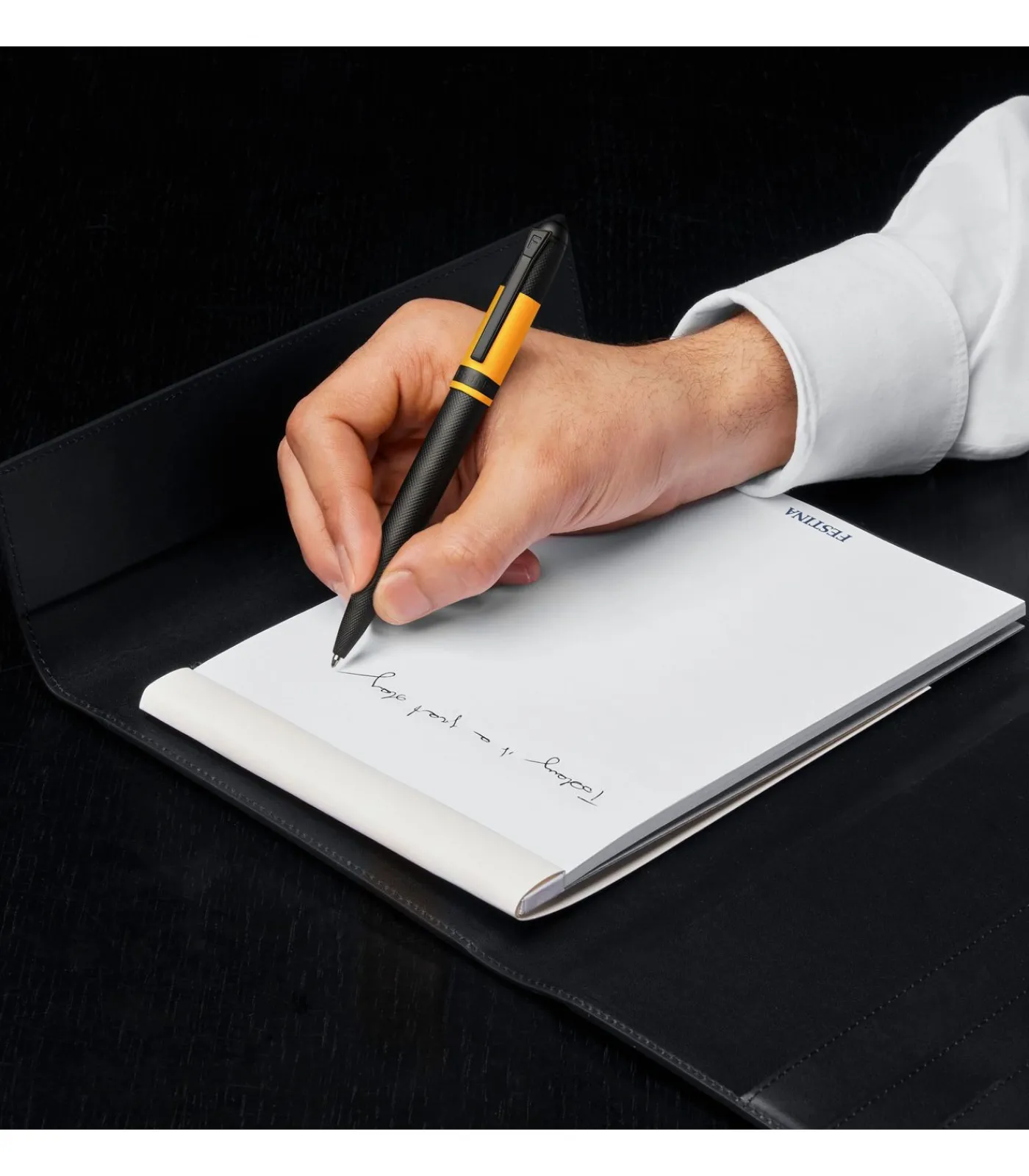 Festina’s best verkopende Classicals pen is opnieuw uitgevonden met een nieuwe capsule editie: een innovatieve afwerking die de pen een eigentijds & luxueus randje geeft. Het oppervlak is gegraveerd en verguld in mat zwart in contrast met de rubberachtige matte lak van de dop, voor een resoluut modern & grafisch resultaat. Deze kleurblokversie is verkrijgbaar in geel, oranje, rood, blauw en groen. Dimensions: DIA.13/H.140 mm, Material: Brass,Rubber,Black plating