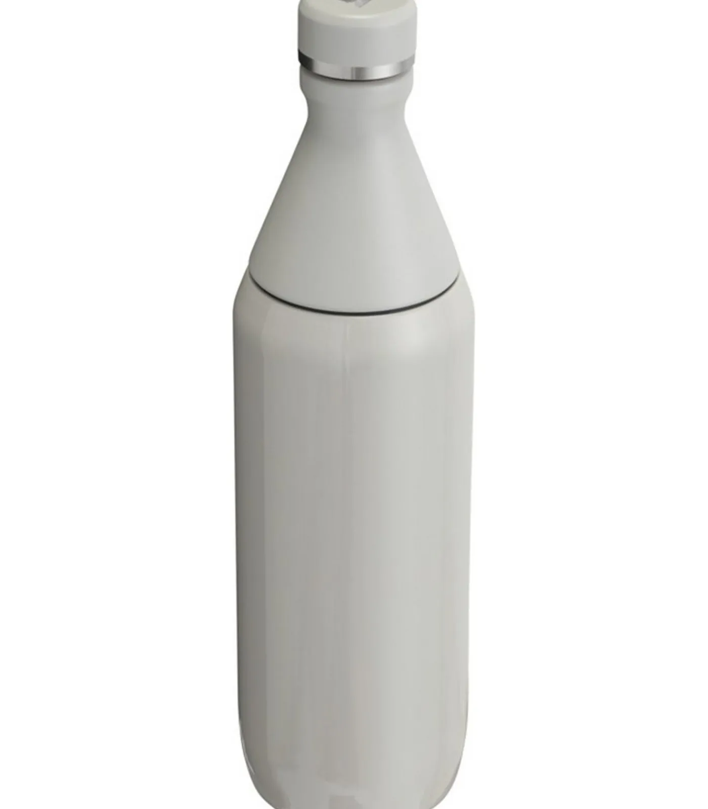 Stanley ALL DAG, waterfles zwart gemaakt van hergebruikt roestvrij staal met een hoogte van 26,4 cm, een lengte en breedte van elk 7,3 cm. Het heeft een dubbele wand, schroefdeksel en is vacuüm geïsoleerd. Het waterfles draagt het logo van Stanley en heeft een capaciteit van 600 ml.