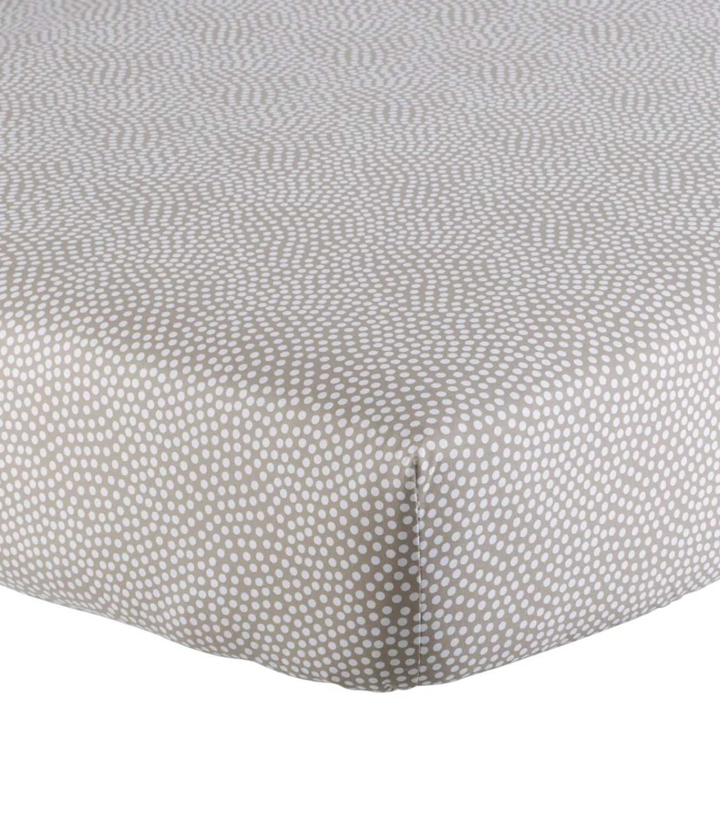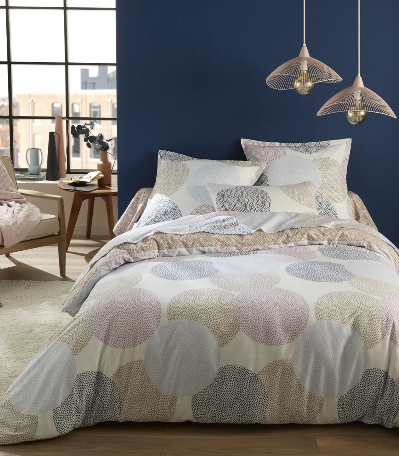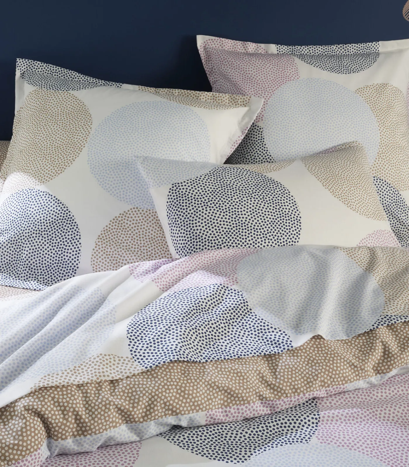 Dekbedovertrek, kussensloop, onderlaken: de delen waaruit het bed is opgebouwd, zijn gekleed in blauwe, violetroze en beige bubbels op een witte achtergrond. Een zwierig motief gecombineerd – op de achterzijde van het dekbedovertrek en op het hoeslaken – met een taupe beige achtergrond bedekt met licht witte stippen. Een leuke en zachte mix die zelfs de meest saaie interieurs opfleurt.