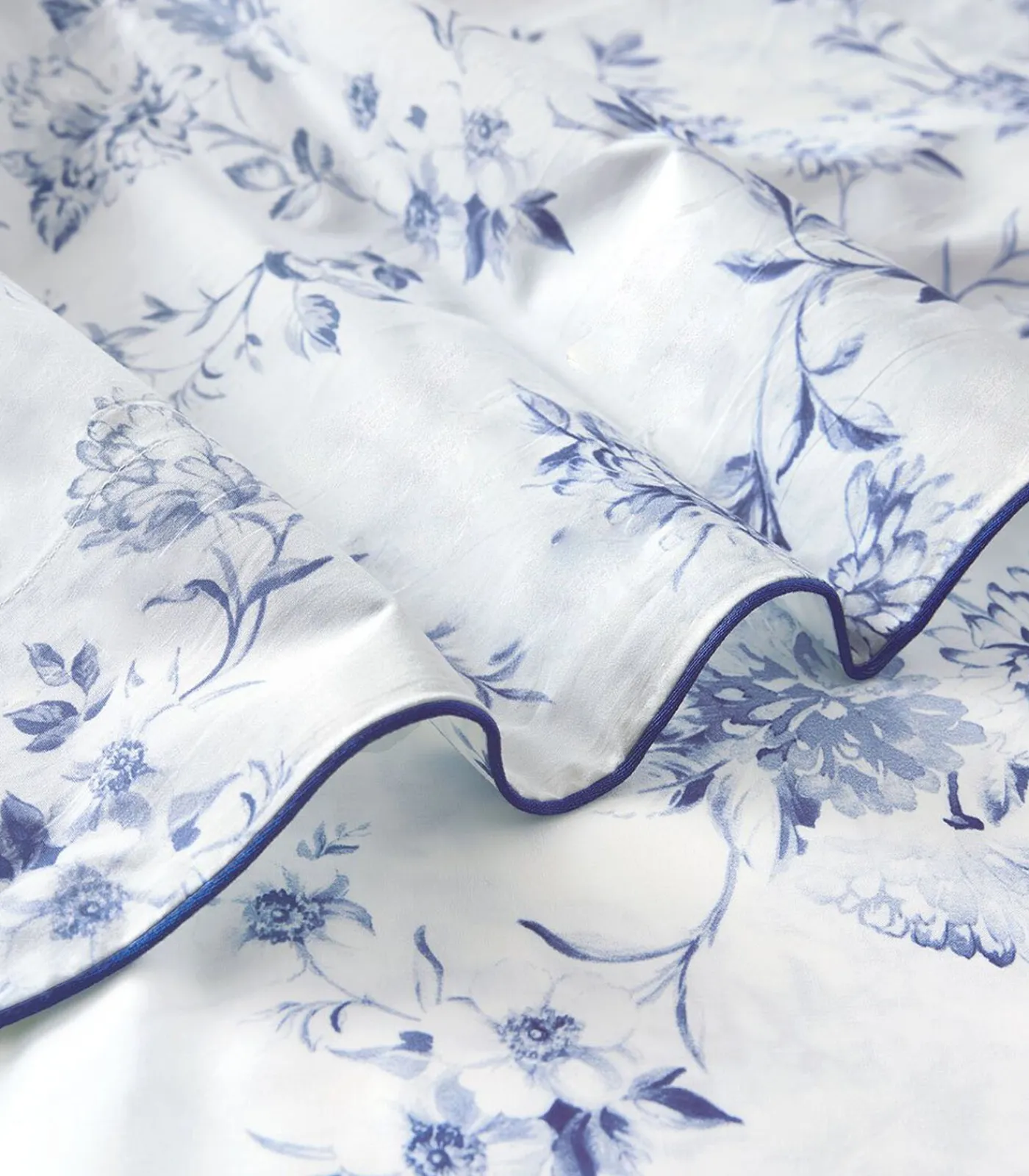 Blauwe bloemenprint op optisch witte achtergrondBies van 8 cmAfwerking met marine biezen