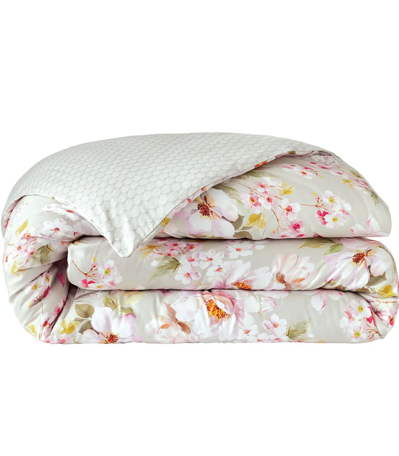 Voorzijde bedrukt met rozen en kersenbloesems op een grègekleurige achtergrond.Achterzijde met palmettenmotief op dezelfde grègetint.Afwerking met flessenhals