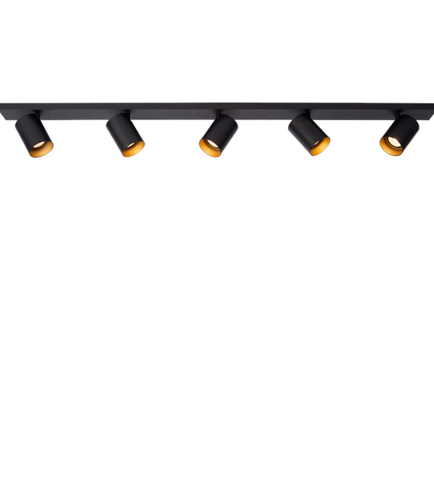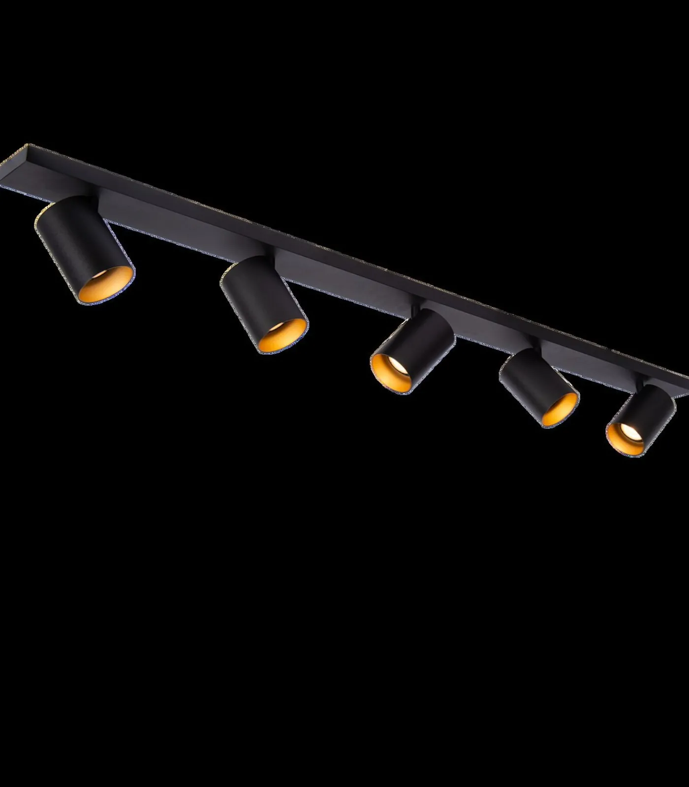 De plafondlamp Nuo 5 is een stijlvolle en moderne lamp met vijf spots. De spots hebben een diameter van 6,85 cm en zijn kantelbaar, zodat u de lichtbundel naar wens kunt richten. De spots zijn zwart aan de buitenkant en goud vanbinnen, wat zorgt voor een warme en sfeervolle uitstraling. De metalen lamp heeft een lengte van 120 cm en past goed in een woonkamer, slaapkamer of hal. Zoekwoorden : Plafondlamp, Plafondspot, Zwart, Goud, Metaal, GU10, industrieel, landelijk