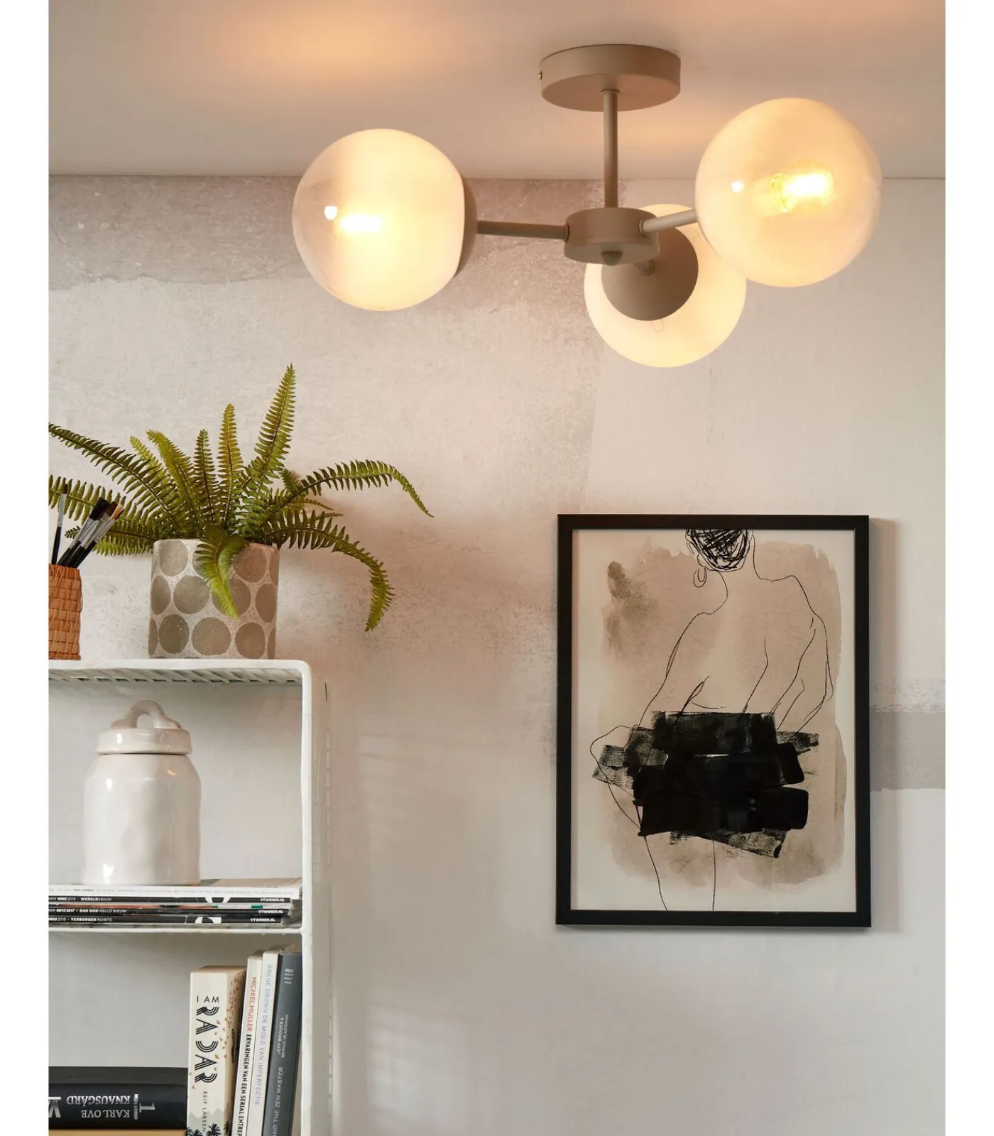 De Aspen 3–arms plafondlamp combineert moeiteloos eenvoud en stijl met een zachte touch dankzij de melkwitte glazen afwerking. Met een afmeting van 54x54x22,5 cm is hij veelzijdig toepasbaar in verschillende ruimtes. Voeg serene klasse toe aan je plafond, woonkamer, eetkamer of keuken met deze vintage blikvanger.