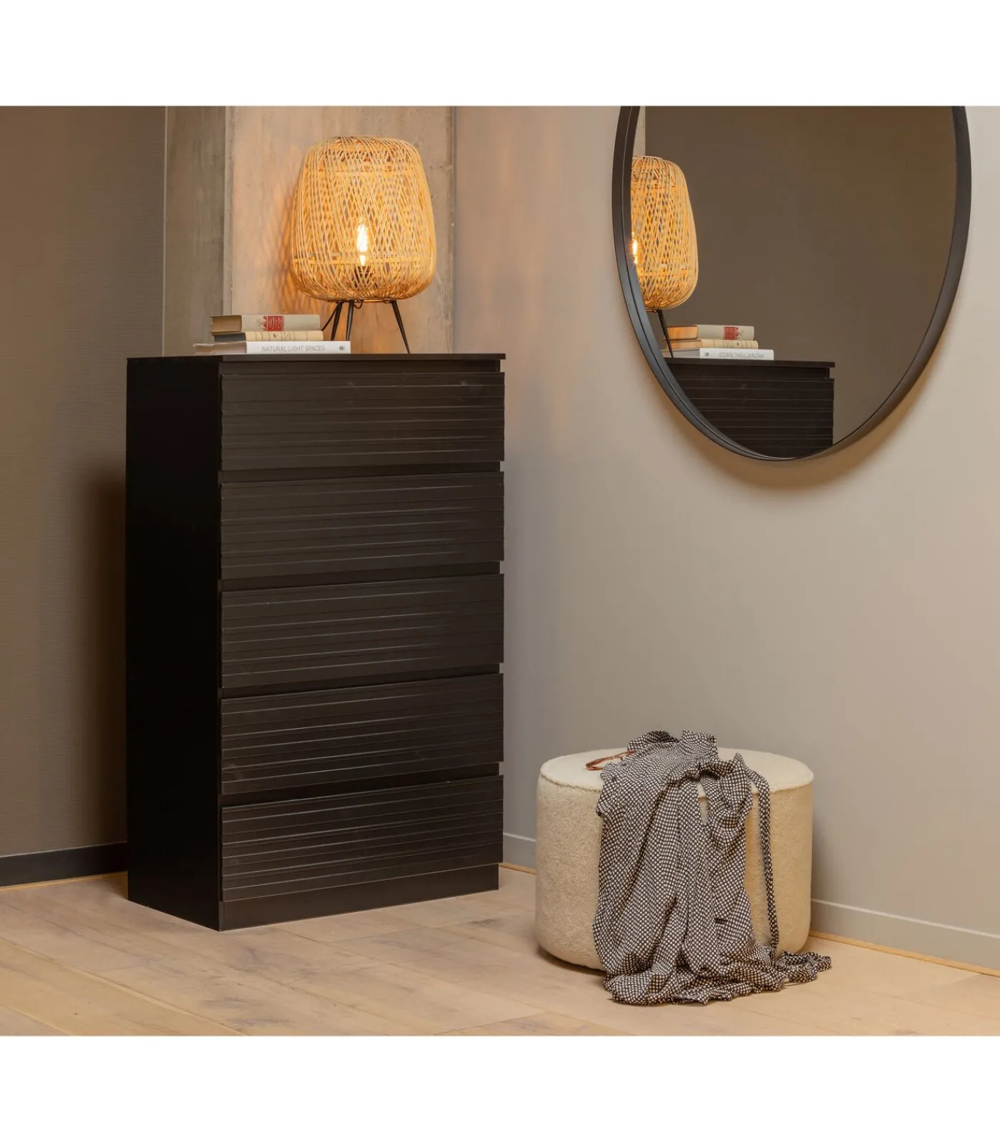 Deze royale ronde spiegel Doutzen komt uit de collectie van het Nederlandse merk WOOOD. De spiegel heeft een HRP sheet metal rand (hot rolled sheet metal), het is een staalplaat die warm gewalst is en geschikt is voor lassen. Dit materiaal wordt vaak in keukens gebruikt en is slijtvast. De stalen rand heeft een zwarte afwerking.