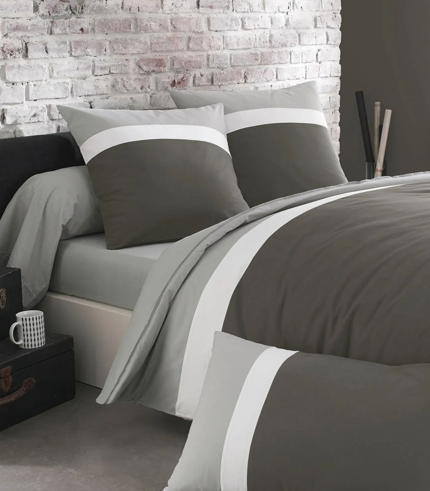 Het kussensloop is tweekleurig, de twee kleuren worden gescheiden door een overhandse naad in lichtgrijs.