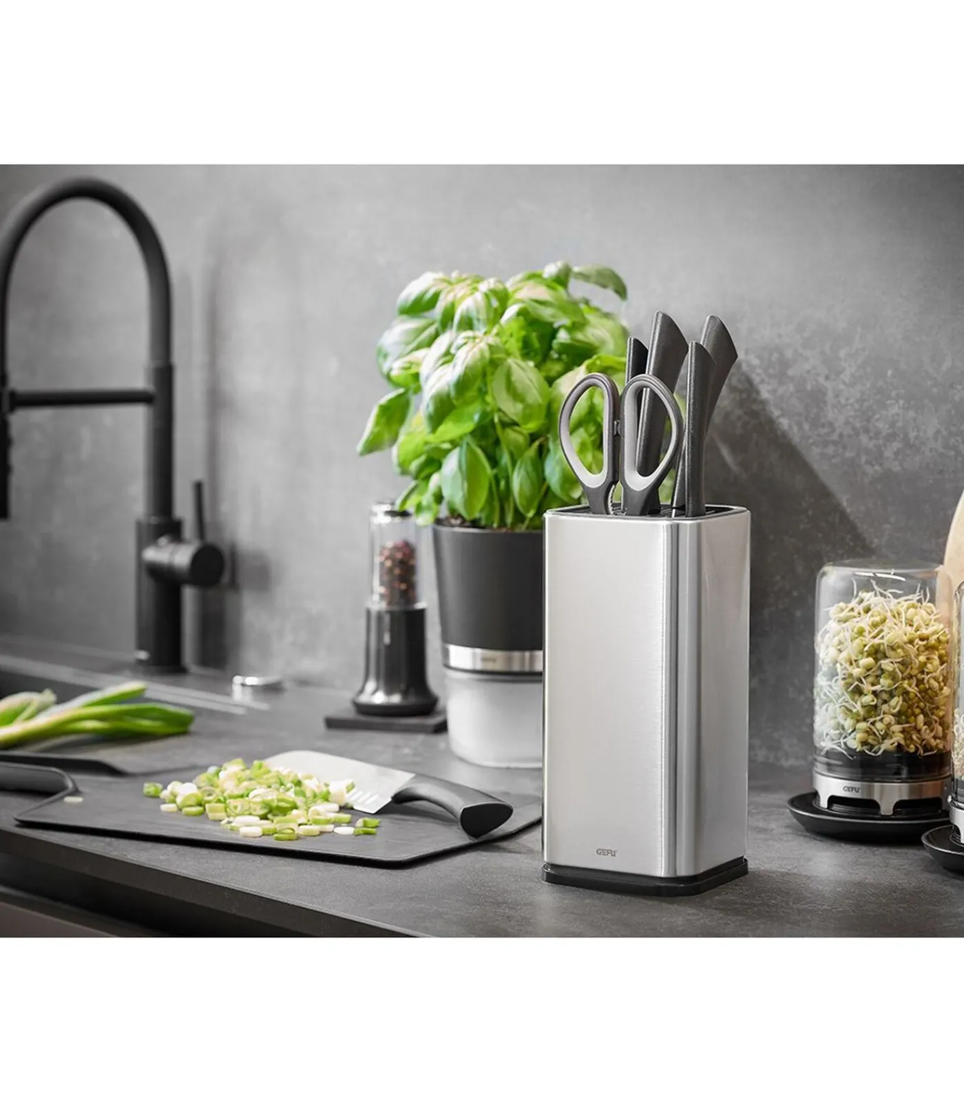 • 14 gleuven voor messen• extra ruimte voor een schaar of messenslijper• stabiliserend gewicht in de bodem voor een veilige stand• verwijderbare bodem voor eenvoudige reiniging