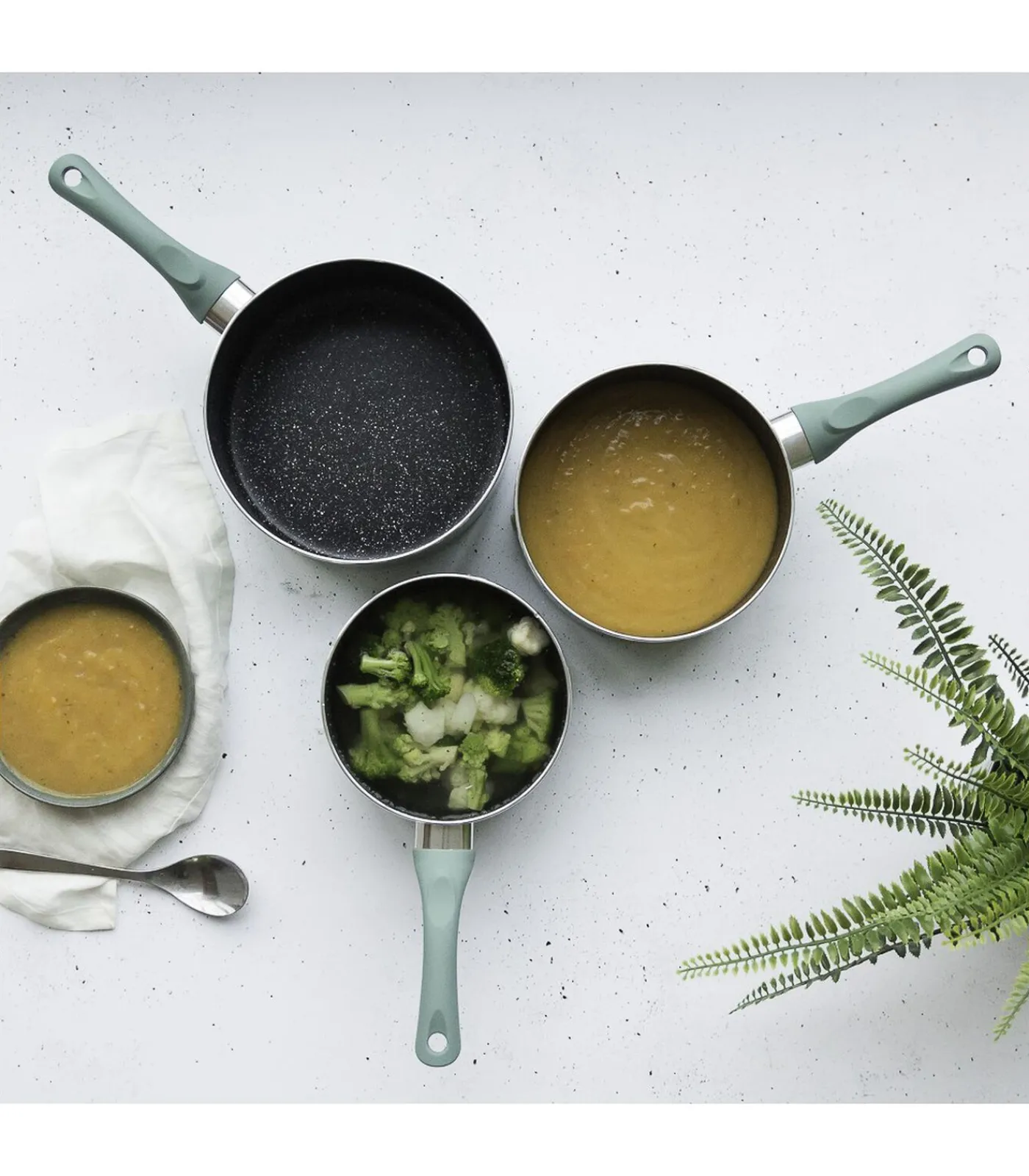Antikleef stenen coating uiterlijk, Ø 16, 18 and 20 cm, Geassorteerde siliconen handvat van 16 cm, Compatibel met koken op gas waaronder inductiekoken, Niet nodig vet toe te voegen
