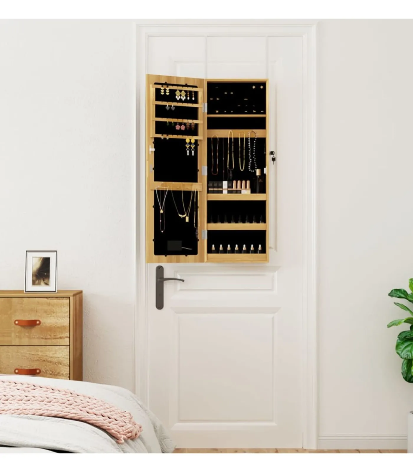 Voldoende opbergruimte: de spiegel met opbergruimte heeft veel haakjes, hangers en plankjes om je sieraden netjes geordend en binnen handbereik te houden.
