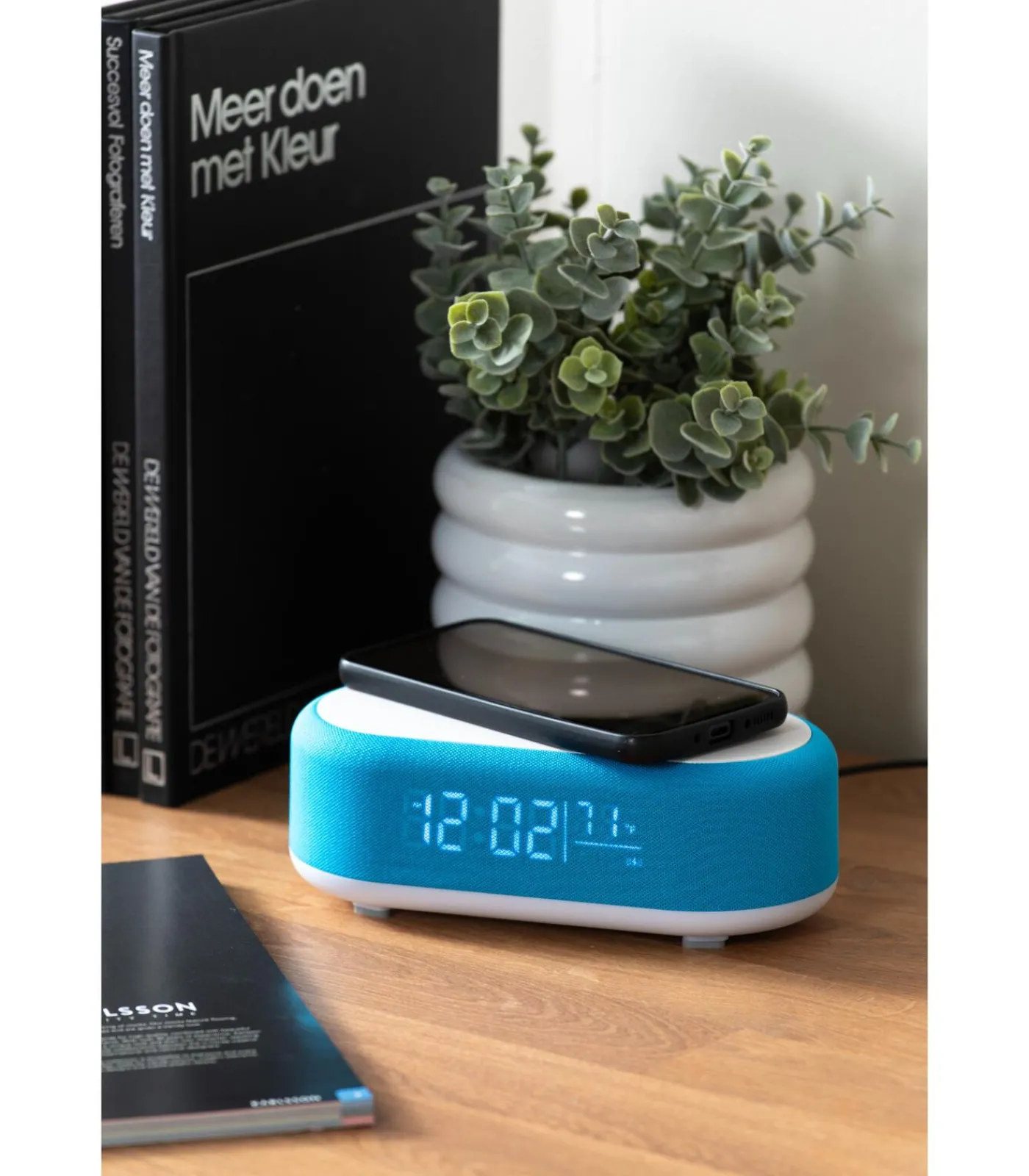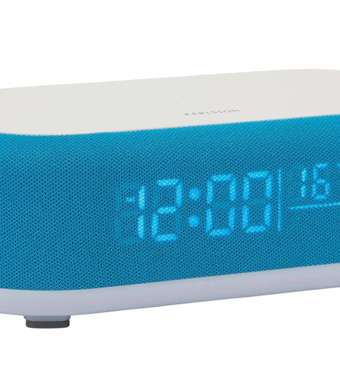 De Vogue wekker van Karlsson combineert design en functionaliteit in één. Met zijn ovale vorm en trendy display met gekleurd stof is hij een echte blikvanger. Maar dat is niet alles, deze wekker is ook een draadloze oplader! Leg je telefoon eenvoudig bovenop en start je dag met een volle batterij. Daarnaast beschikt hij over Bluetooth, zodat je jouw favoriete muziek of wekgeluid kunt afspelen. Een must–have voor de moderne slaapkamer!