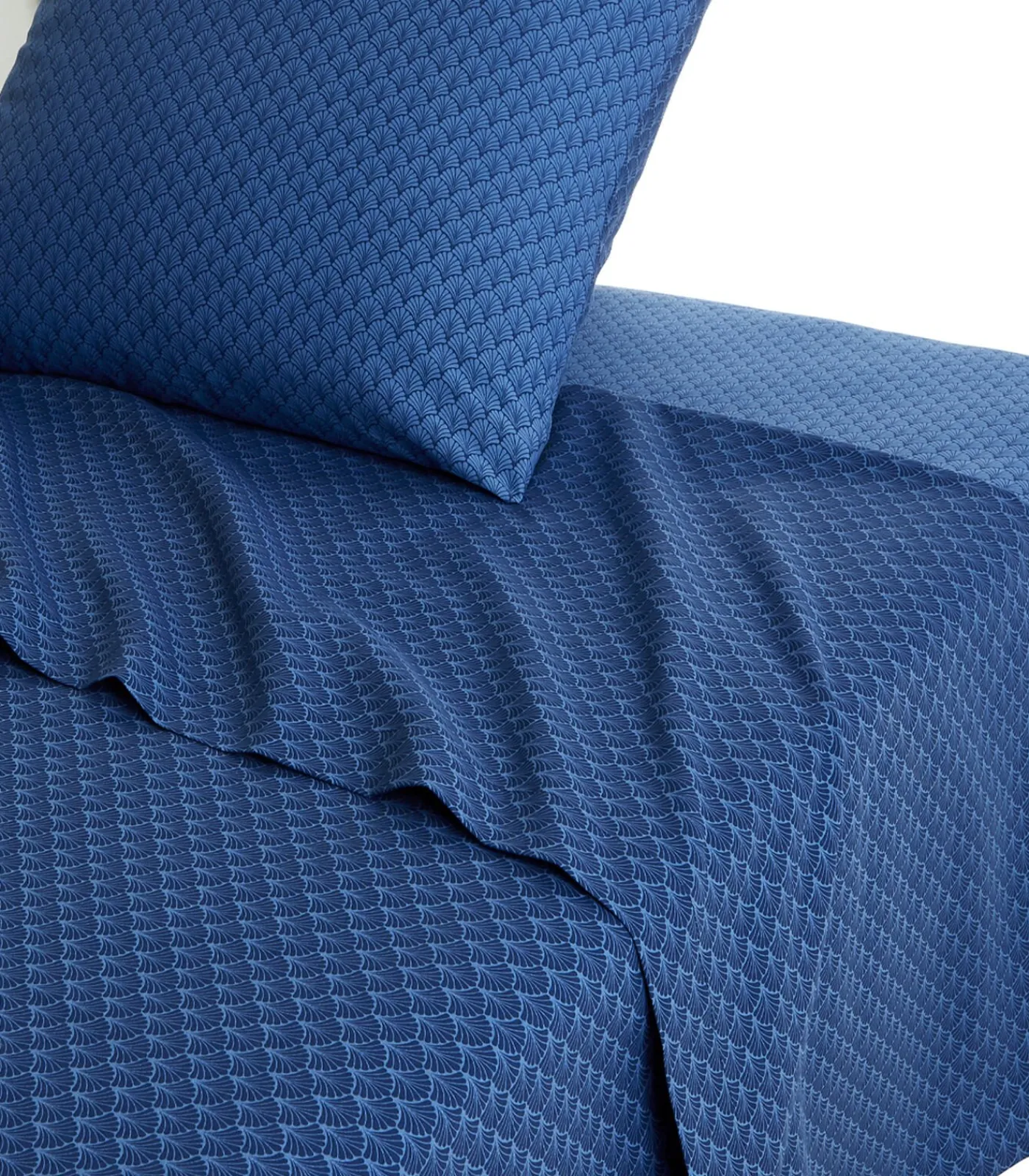 Het laken is bedrukt in een motief met ‘schubben’ (in dezelfde kleur als de keerzijde van het dekbedovertrek) en heeft een omslag met een hoogte van 24 centimeter.