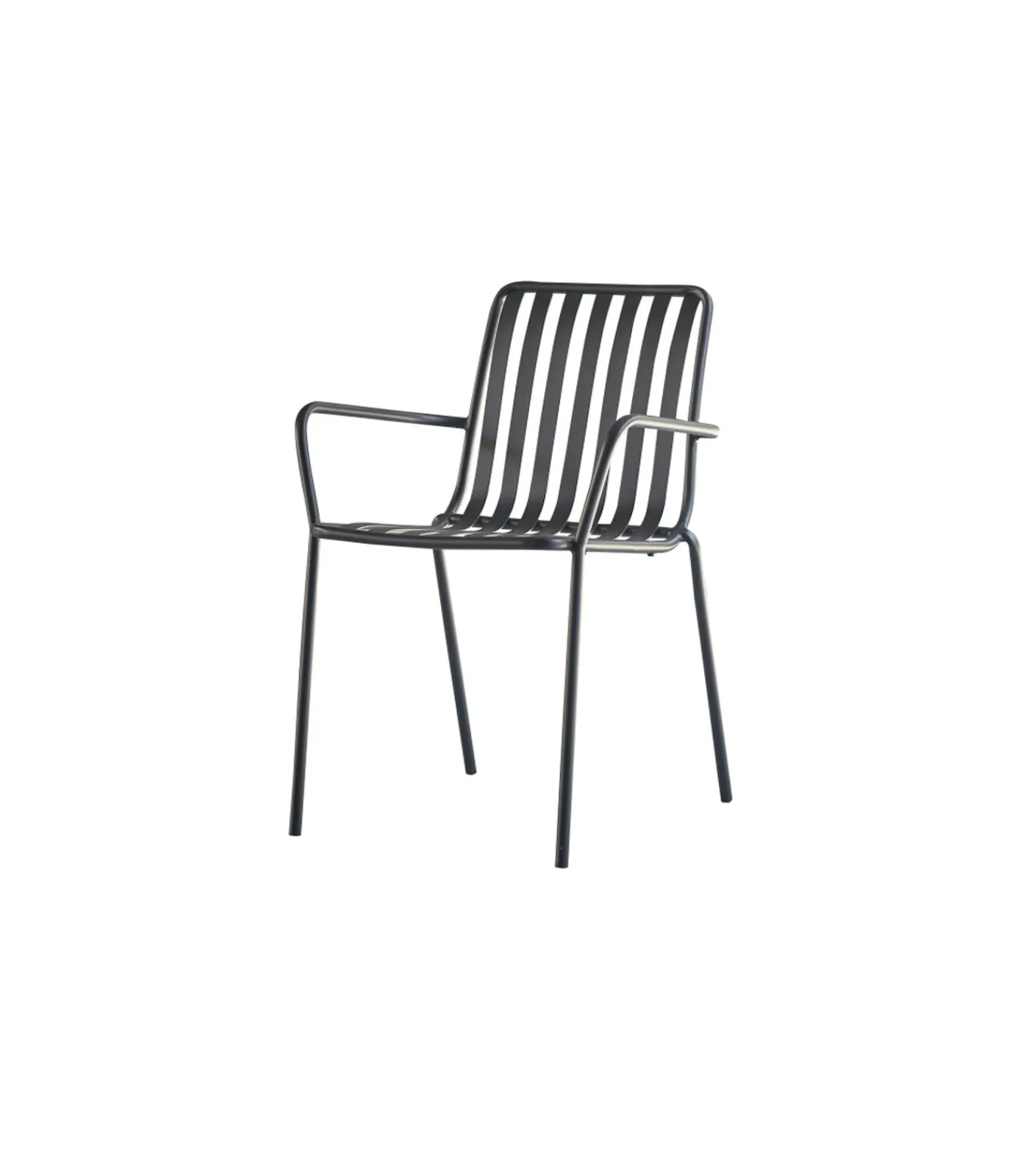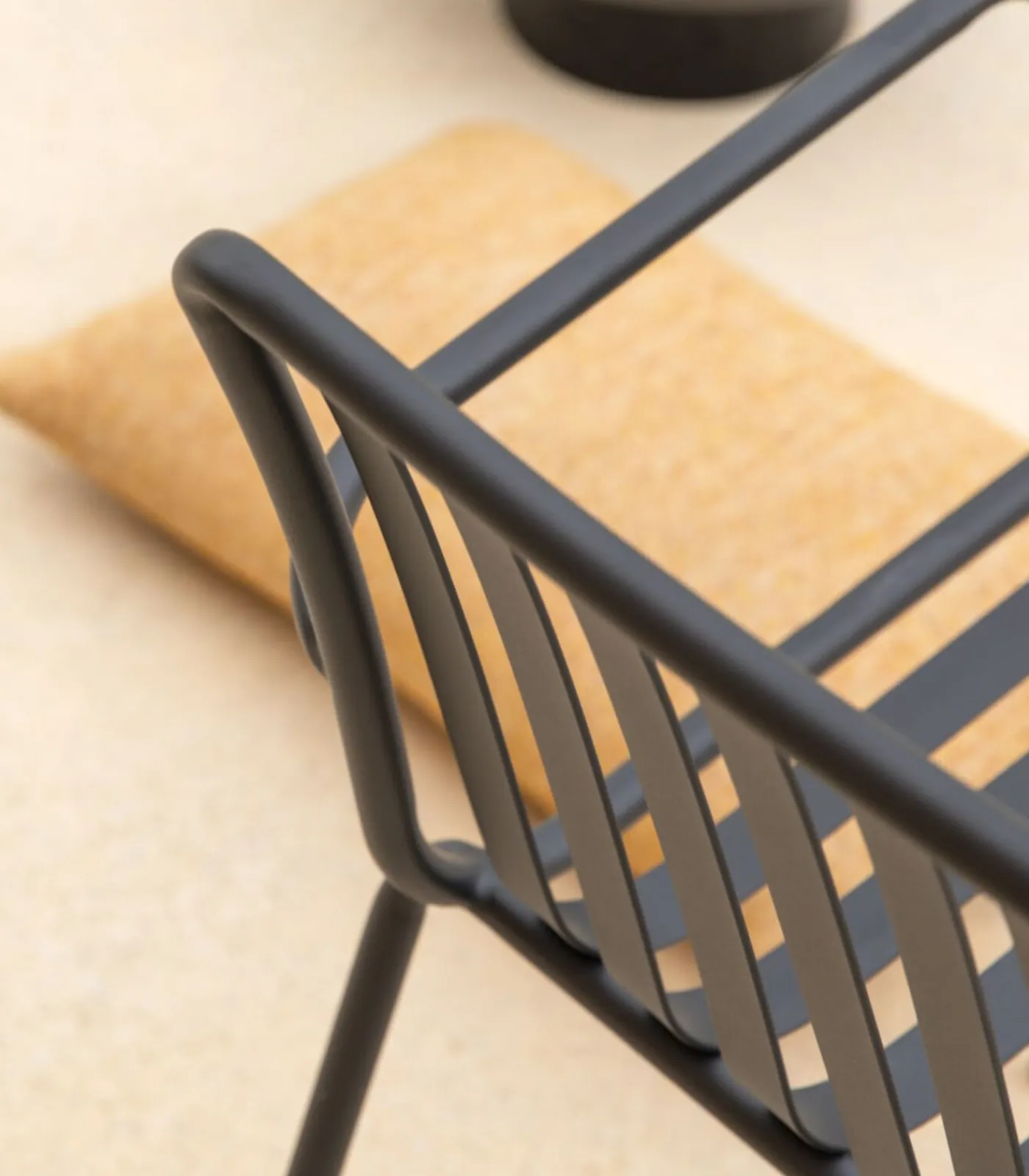 De zwarte metalen stoel Gaby is ook verkrijgbaar in wit en oranje. Om een tuinsalon vol persoonlijkheid te creëren, kun je deze tuinstoel afwisselen met bijpassende zwart metalen Gaby–stoelen.