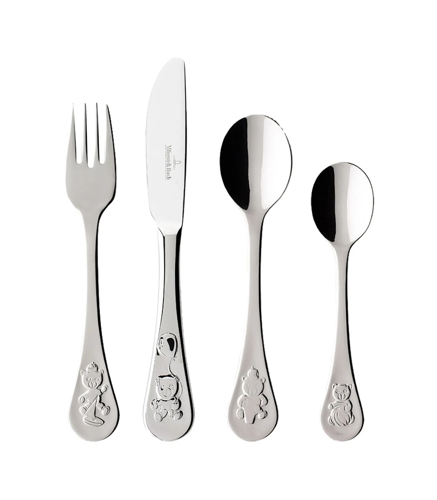 Het kinderbestek met een grappig teddybeer–motief zorgt er gegarandeerd voor dat kinderen veel plezier hebben bij het eten. Het bestek is gemaakt van robuust roestvrij staal en ligt perfect in balans in kleine kinderhanden. Villeroy & Boch staat sinds 1748 voor tafelcultuur van de allerbeste kwaliteit. Mes, vork, grote en kleine lepel zijn ideaal voor kinderen voor ontbijt, lunch of diner. Doe kinderen, nichtjes, neefjes en kleinkinderen een plezier. Wordt geleverd in kleurrijke cadeauverpakking.