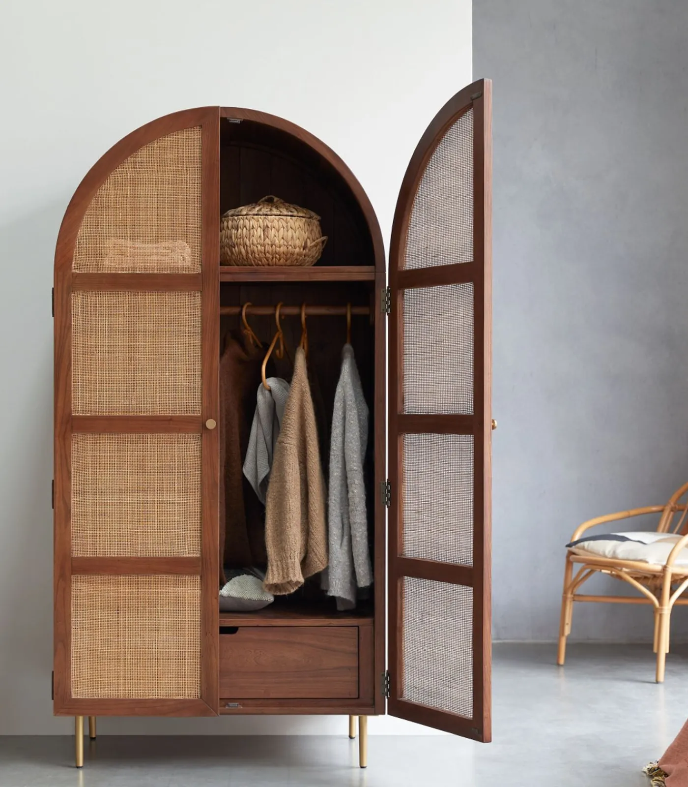 Rotan heeft opnieuw helemaal zijn plek verworven in hedendaagse interieurs! De Lisbeth kast van iepenhout en rotan is geïnspireerd door verre bestemmingen en voegt een exotisch tintje toe aan uw slaapkamer. Alles zit in de rondheid, het meubel combineert minerale kleuren, natuurlijke materialen, eeuwenoude kennis en biedt een ruime opslagcapaciteit. Detail: de grote lade onder, handig voor kleine kledingstukken zoals sokken of lingerie.De Lisbeth kast in iepenhout en rotan is ideaal voor de slaapkamer, kan evengoed worden geplaatst in een ruime hal voor de jassen en tassen, als aanvulling op een inloopkast… en zelfs in de woonkamer! Geverniste afwerking. Aarzel niet onze andere meubelen uit het assortiment Néo Ethnique te ontdekken en creëer een huis dat uitnodigt tot reizen…