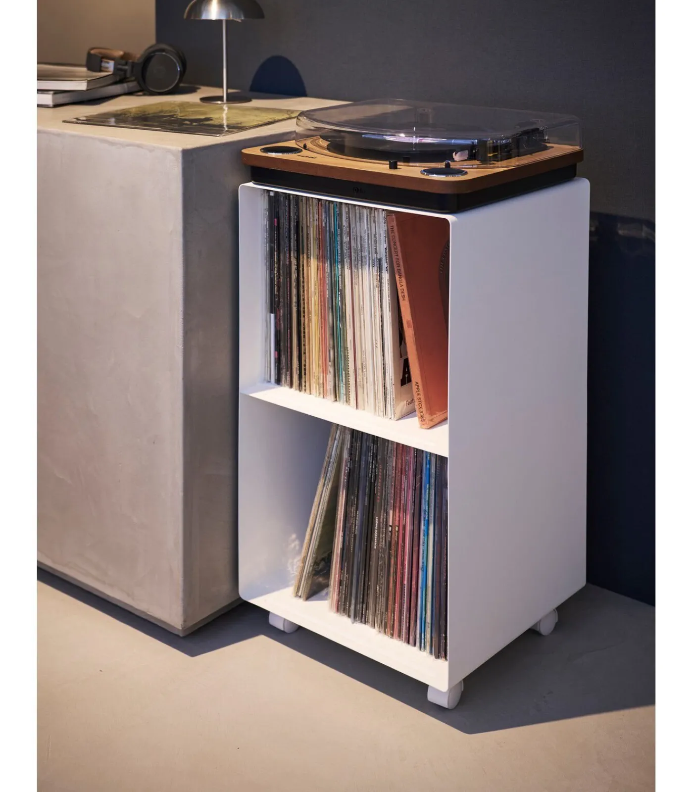 Deze platenkast van Yamazaki biedt ruime opbergruimte voor je favoriete vinylplaten. Het bovenblad is geschikt voor het plaatsen van een platenspeler, zodat je direct kunt genieten van je muziek. Dankzij de wieltjes aan de onderzijde is de kast eenvoudig te verplaatsen, wat extra flexibiliteit biedt in je interieur.