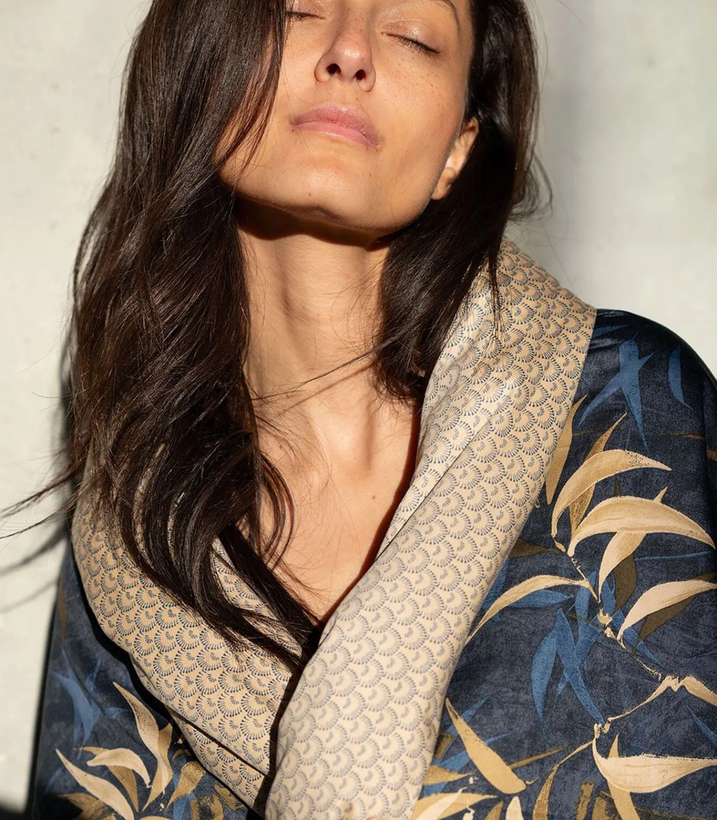 Nachtblauwe palmettenprint op goudbeige achtergrond”