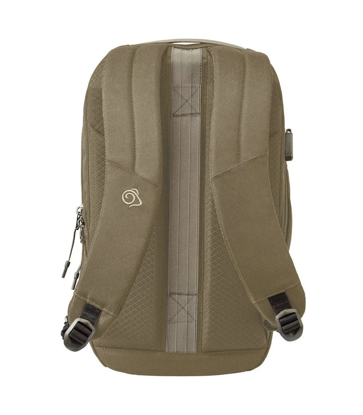Craghoppers ANTI–THEFT groene rugzak is gemaakt van EVA, polyamide, polyester en PU–verf. Het denier bedraagt 900D. De lengte van de rugzak is 50 cm, de breedte is 27 cm en de diepte is 19 cm. De rugzak heeft technologieën zoals Anti–Odour en EcoShield om je kleding goed af te zuiveren en de wereld beter te beschermen. Het ontwerp van de rugzak bevat een logo. De rugzak kan worden vastgemaakt met klips of riitssluitingen. De schouderriem is verstelbaar en heeft anti–diefstal functies, een café–band, draaggreep, hoofdtelfoonpoorten en kabelopberglusje. Verder is de rugzak waterafstotend, perforaat, met reflecterende details en een schouderriem van geweven band. De rugzak heeft een bagagehandvat op wieltjes. Het rugzak heeft compartimenten zoals 1 hoofdcompartiment en 1 compartment met riit. De rugzak telt 1 RFID Blocking Pocket, 1 Front Pocket, 1 zip–pocket, 1 mesh pocket, en 2 zijzakken. Het wordt gemaakt van hergebruikt materiaal. De ruimte in de rugzak is 25 liter en het kan een laptop met een schermgrootte van 16 inch vervoeren. De rugzak is snijbestendig.
