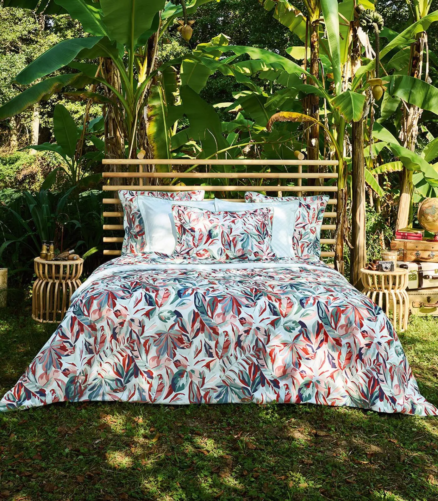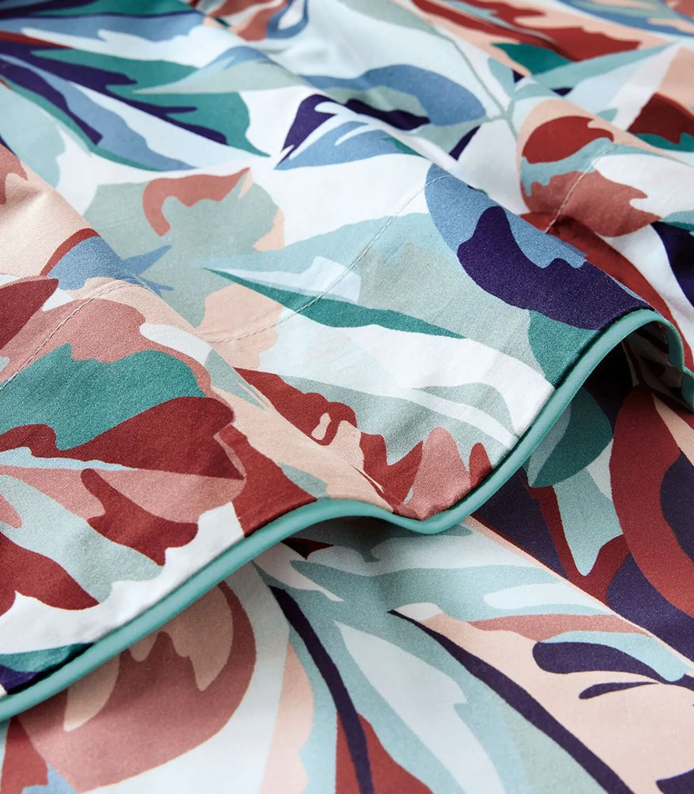 Meerkleurige exotische bladerenprintBies van 8 cm.Afwerking met groene bies.