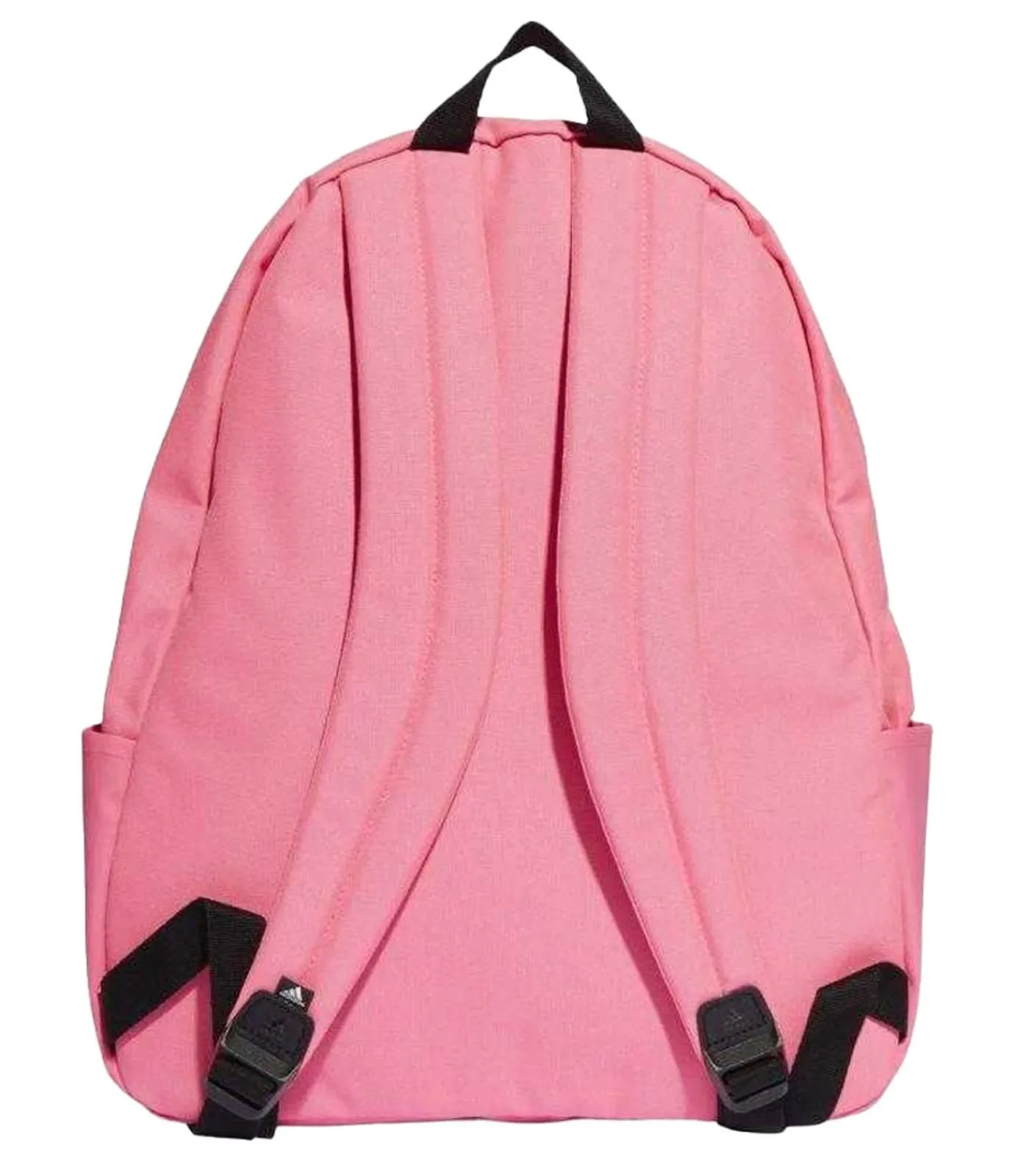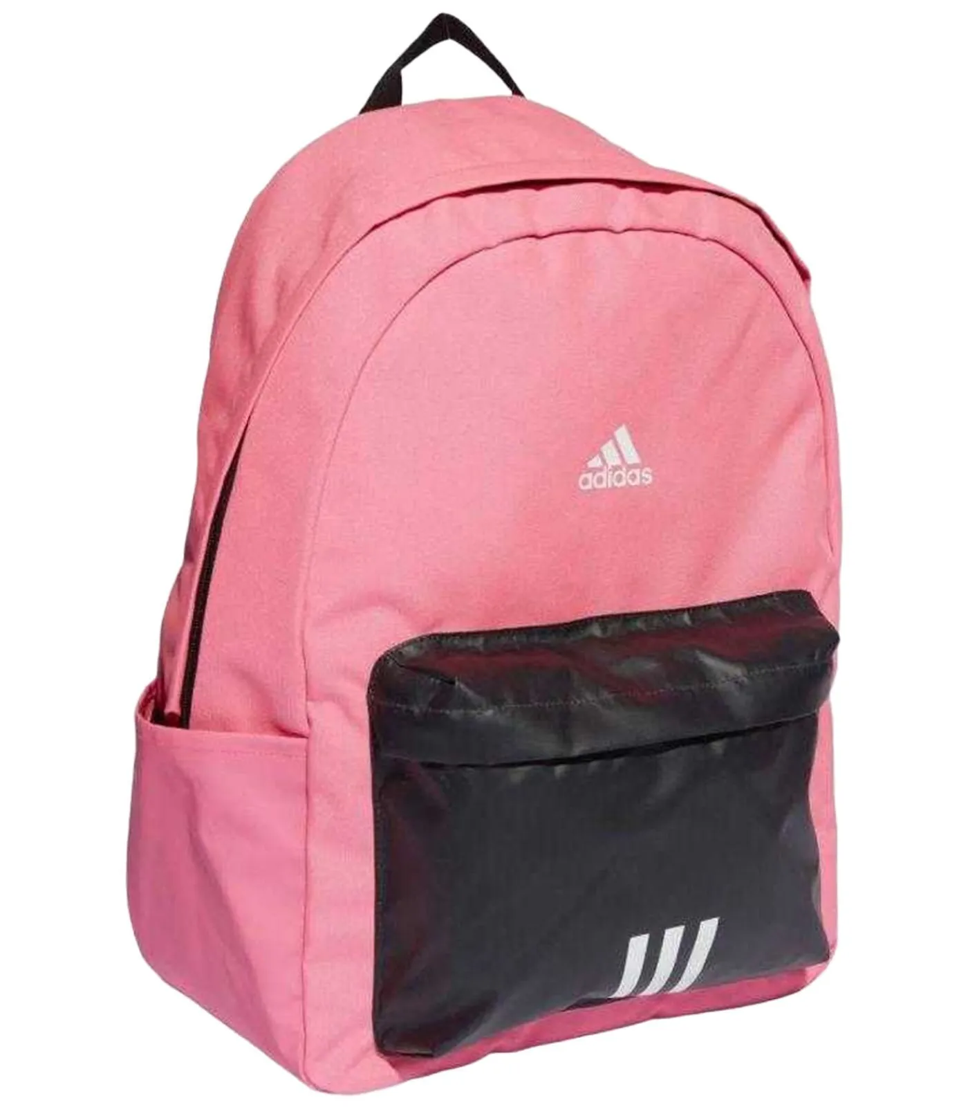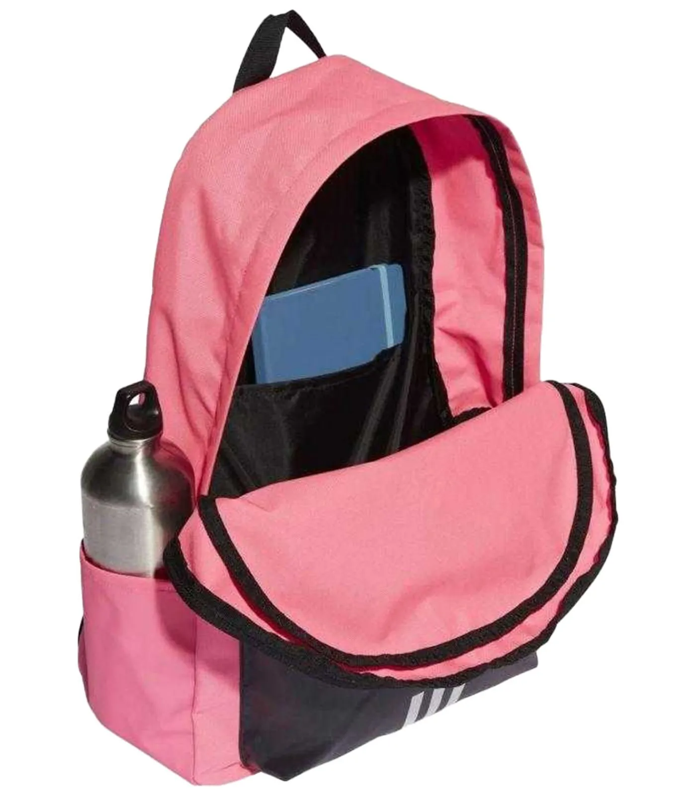 Adidas–brand rugzak met classic sportlabel – roze kleur, gefillt met 100% polyethyleen buitenmaterialen en 100% gerecycled polyester voor lining en voering. Het materiaal is gemaakt van een gluip weefsel, de hoogte bedraagt 44cm, breedte 36cm, inhoud 27,5L en diepte 15cm. De rugzak heeft een voorzak, een ripsluiting, twee steekzakken en een zijzak. Het hoofdcompartiment is verstelbaar via de schoudergordel en draaggreep. Het ontwerp van deze rugzak bestaat uit color block, logo en gestreept en wordt vastgezet met ritssluitingen.