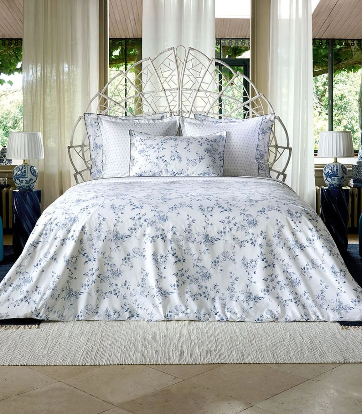 Blauwe bloemenprint op optisch witte achtergrondAchterkant met blauwe faïenceprint op optisch witte achtergrondAfwerking met flessenhals