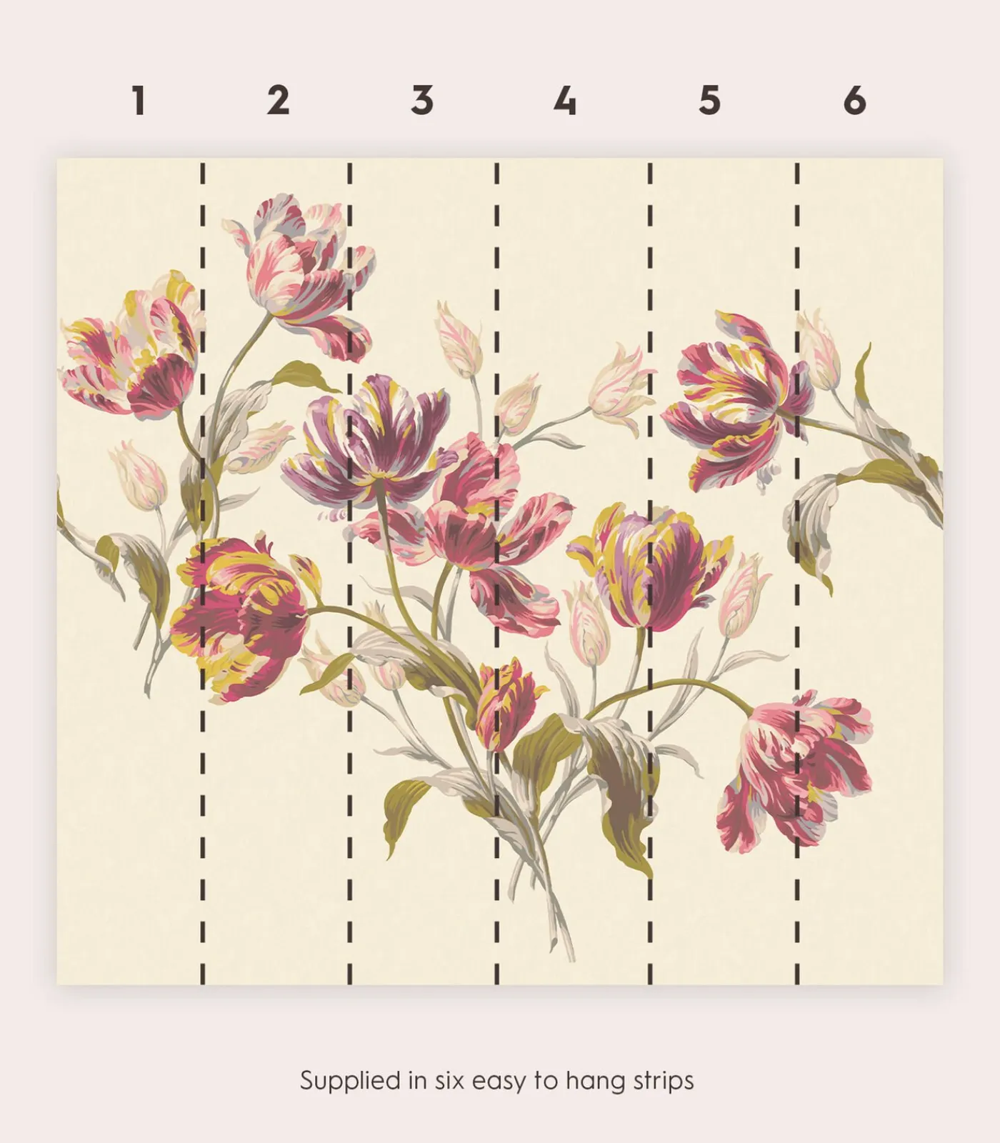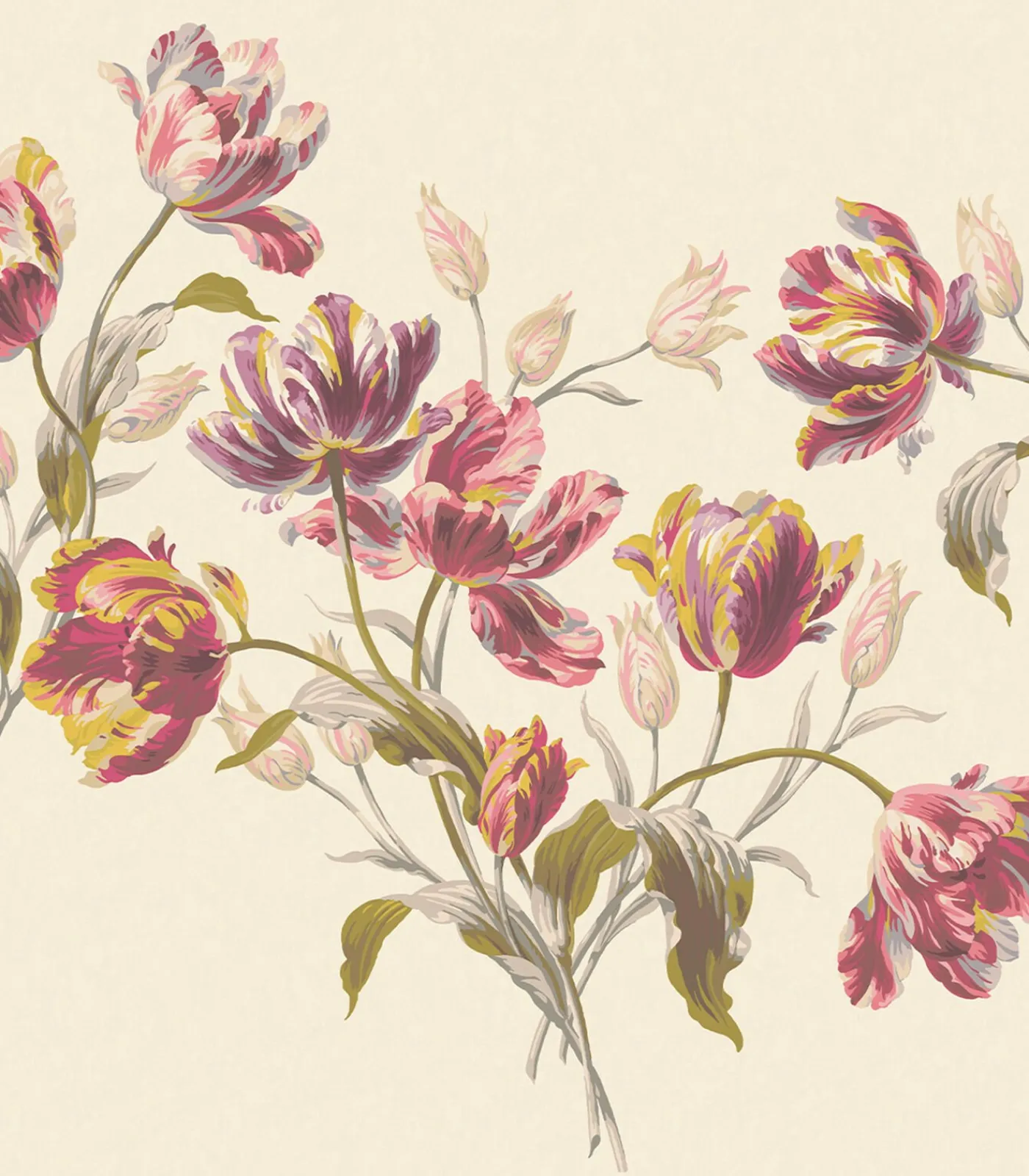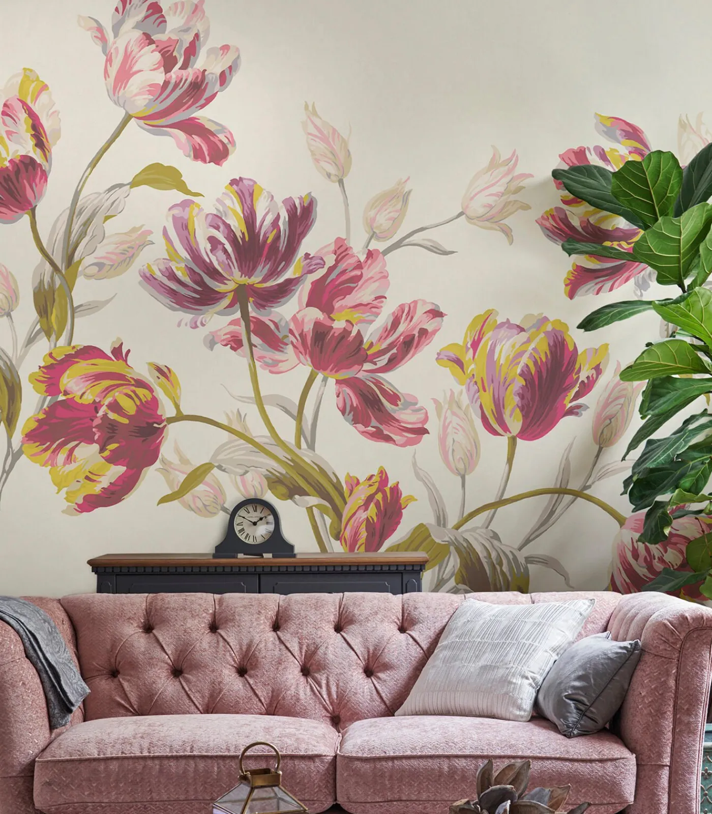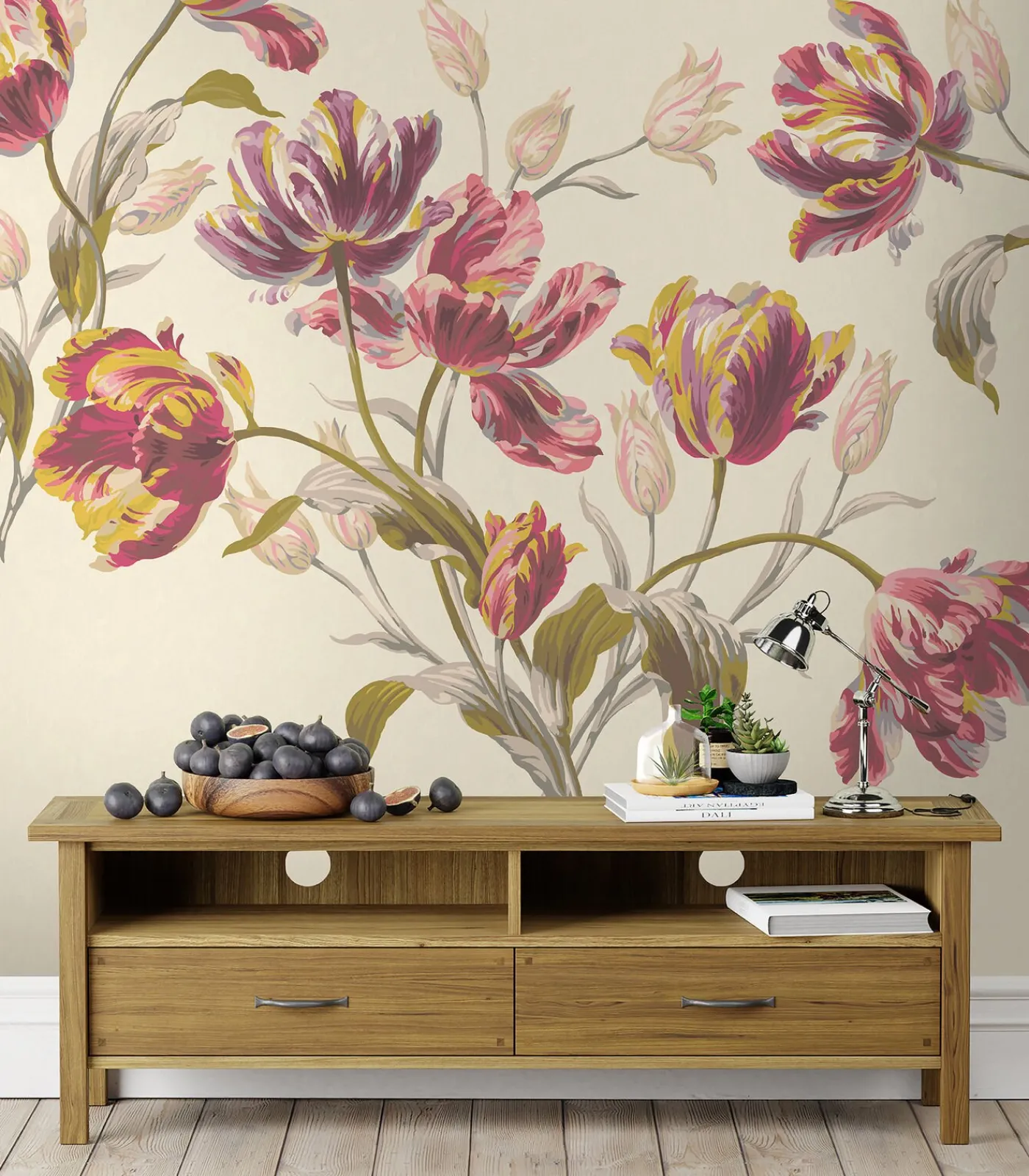 Dit prachtige fotobehang is ontworpen in een handgeschilderde stijl, waardoor het een unieke en authentieke uitstraling heeft. De heldere kleuren van de tulpen springen uit boven de roomkleurige achtergrond, waardoor een harmonieus en rustgevend effect ontstaat.
