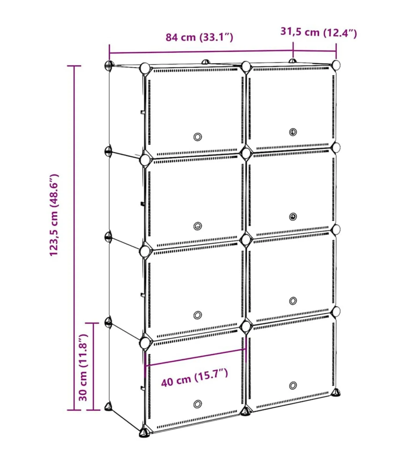 Snelle installatie en demontage: de opbergorganizer is voorzien van connectoraccessoires die een snelle montage en demontage mogelijk maken, zodat je in een mum van tijd gemakkelijk je eigen op maat gemaakte opbergkast kunt maken. Wanneer ze niet in gebruik zijn, is het gemakkelijk om de panelen te scheiden en te stapelen om ruimte te besparen.