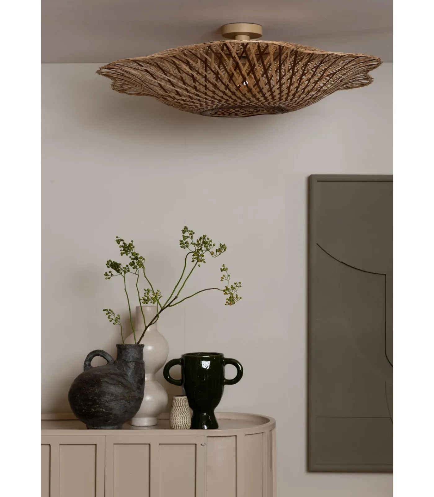De Madura plafondlamp naturel/bruin is geïnspireerd op de exotische schoonheid en rijke cultuur van het Indonesische eiland Madura. Dit unieke bloemvormige ontwerp en de kleur van natuurlijk bamboe roept de delicate vormen van tropische bloemen en de ambachtelijke tradities van het eiland op. De plafonnière is geweven in 2 natuurlijke tinten bamboe wat zorgt voor een speels effect. Door het geweven materiaal vormt er zich een prachtig spel van licht en schaduw. Het licht straalt een warme, uitnodigende sfeer uit. Voeg organische elegantie toe aan je slaapkamer, woonkamer of eetkamer met deze plafondlamp. De Madura plafondlamp is perfect voor wie houdt van een interieur vol natuurlijke schoonheid en authentieke charme.