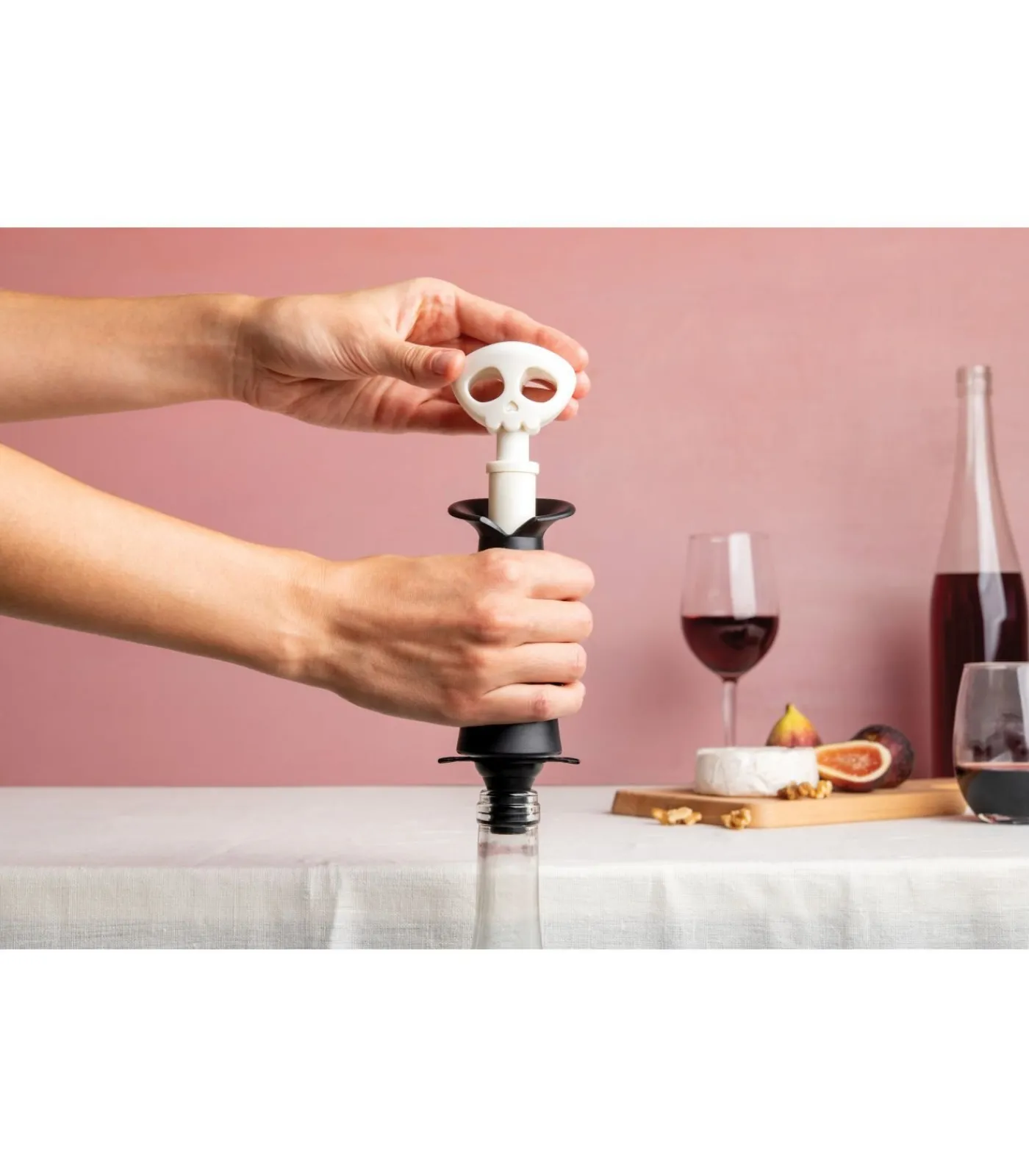 Met de Spookelier van Ototo voeg je een griezelige touch toe aan wijnflessen én houd je je wijn langer vers. Deze slimme set bevat een vacuümpomp en drie stoppers die lijken op vleermuizen. Het gebruik is kinderspel: plaats een stopper in de fles, trek de Spookelier een paar keer omhoog en creëer zo een vacuüm. Wanneer je een ‘klik’ hoort, weet je dat de fles perfect afgesloten is. Klaar met bewaren? Duw de knop opzij om het vacuüm vrij te geven. De stoppers kunnen gewoon in de vaatwasser, maar de pomp moet met de hand gewassen worden.