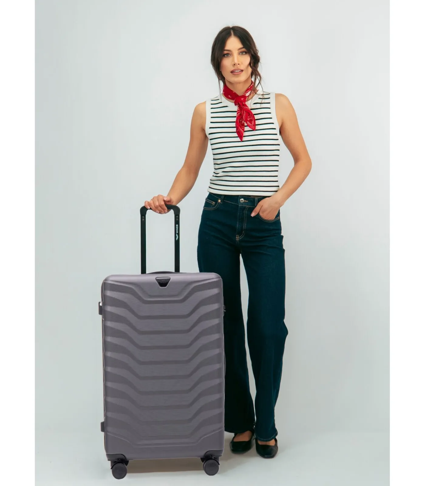 De WINGS PEAFOWL koffer in maat L biedt veel opbergruimte en combineert een elegant design met hoge functionaliteit – ideaal voor lange reizen met ingecheckte bagage. De stevige ABS+ harde schaal (acrylonitrilbutadieenstyreen) beschermt je bagage betrouwbaar tegen krassen, vocht en stoten en is bovendien gemakkelijk schoon te maken.Het interieur is slim uitgedacht: een tweedelig hoofdvak met ritssluiting, elastische kruisbanden en een extra binnenvak zorgen voor orde en eenvoudige organisatie. De zwarte binnenvoering benadrukt de elegante look.Vier 360° roterende, dubbel gemonteerde wielen van rubber en een in hoogte verstelbare, zwarte telescopische handgreep van duraluminium zorgen voor comfort tijdens het transport. Er is een geïntegreerde haak aan de zijkant voor het ophangen van kleine tassen – een praktische extra voor frequente reizigers.De afmetingen zijn ongeveer 75 × 48 × 30 cm, inclusief alle uitstekende elementen. Maattolerantie: +/– 2 cm. Het volume is ongeveer 97 liter.De PEAFOWL koffer in maat L is de perfecte keuze voor veeleisende reizigers die ruimte, comfort en een stijlvol uiterlijk even belangrijk vinden.