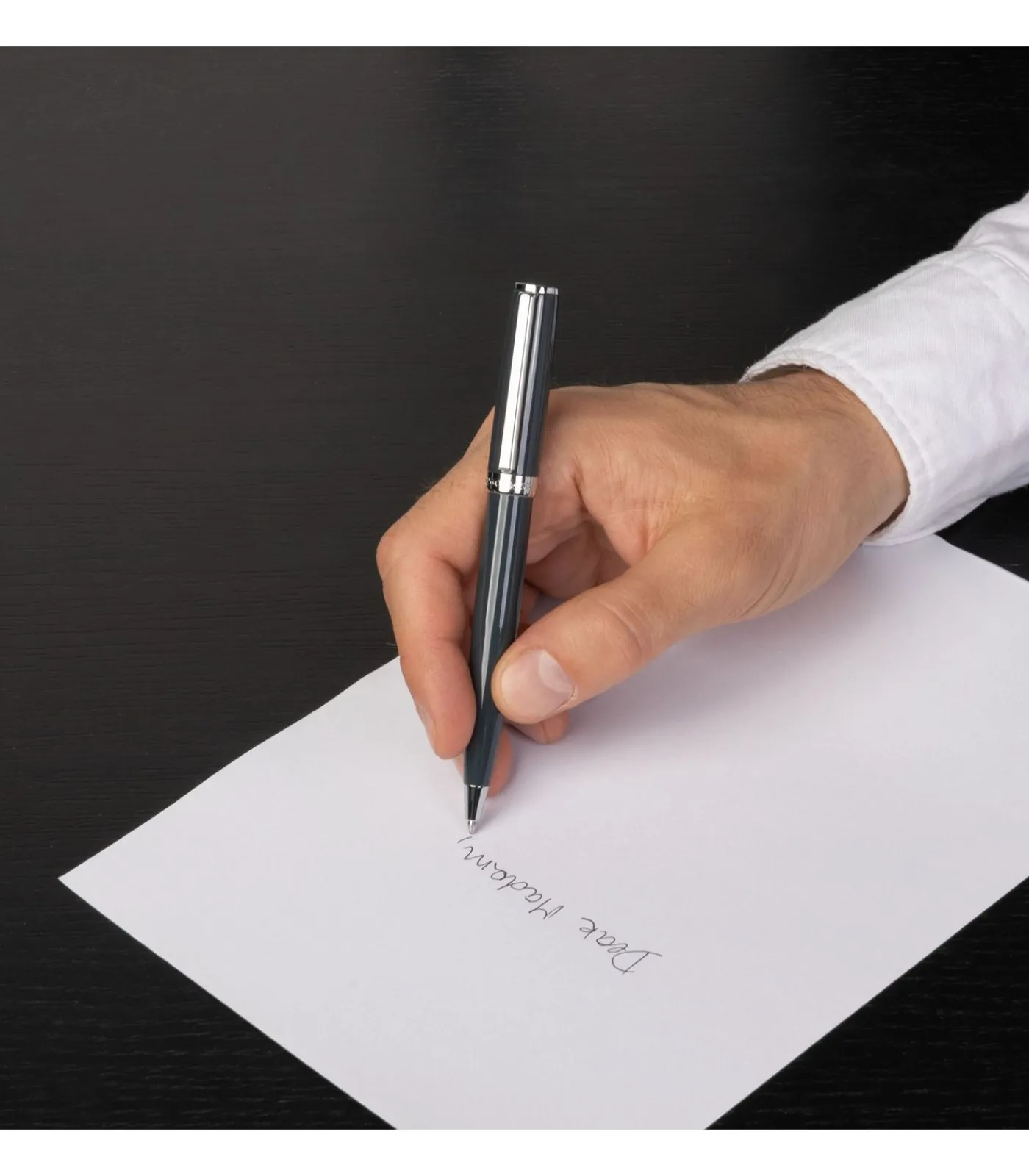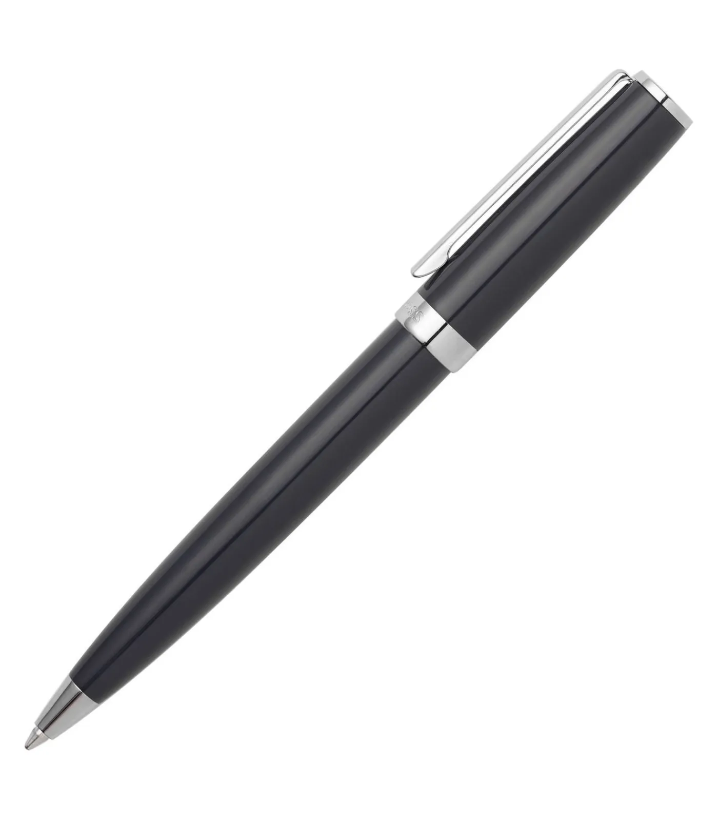 De allernieuwste versie van de iconische Gear balpen van Hugo Boss. Het bekende silhouet met een tijdloze twist, voorzien van een simplistische logo ring met glanzende lak. Het perfect gebalanceerde systeem zorgt voor een ultieme schrijfervaring. Deze luxe pen is verkrijgbaar in vele verschillende kleuren, zowel neutrale, zoals deze donkergrijze versie, als ook in trendy zachte pasteltinten. Dimensions: DIA.12/H.136 mm, Material: Brass,Metallic paint (shiny),Chrome plating
