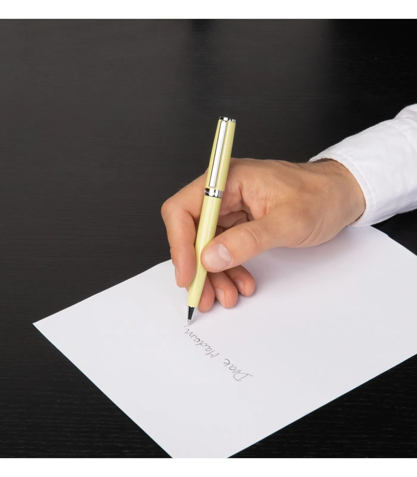De allernieuwste versie van de iconische Gear balpen van Hugo Boss. Het bekende silhouet met een tijdloze twist, voorzien van een simplistische logo ring met glanzende lak. Het perfect gebalanceerde systeem zorgt voor een ultieme schrijfervaring. De pen wordt geleverd in een luxe design geschenkbox en is verkrijgbaar in vele verschillende kleuren, zowel neutrale, als ook in trendy zachte pasteltinten zoals deze zachtgele versie. Dimensions: DIA.12/H.136 mm, Material: Brass,Metallic paint (shiny),Black chrome