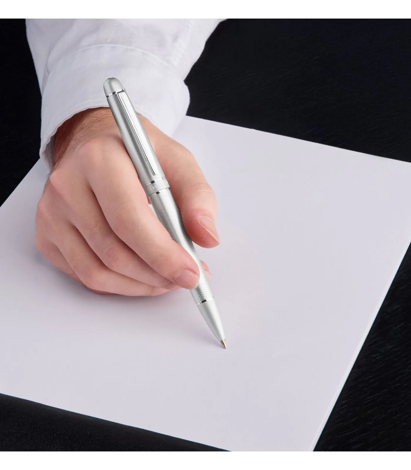 Een klassieke vorm, versierd met een chevron gravure op het oppervlak die de textielprint van de gelijknamige tassenlijn weerspiegelt, deze volledig zilveren pen straalt tijdloze charme uit. Het samenspel van matte en glanzend zilveren randen op de middenring versterkt de verfijnde esthetiek, waardoor het een verfijnde en betaalbare keuze is. Dimensions: DIA.12/H.138 mm, Material: Brass,Chrome plating,Lacquer