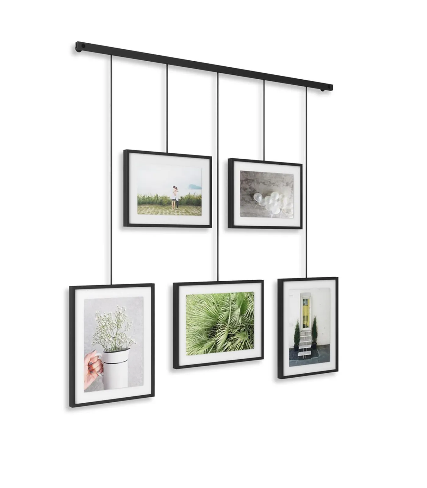 Exhibit bestaat uit een metalen staaf die aan de muur wordt gemonteerd, waaraan dan met clips en beugels vijf fotolijsten worden opgehangen. Dat betekent minder boren, en dus minder schade aan de muur. De beugels met de fotolijsten hangen aan de staaf en kunnen helemaal naar wens verschoven worden. Exhibit is erg flexibel en kan ook perfect schuin boven de trap worden opgehangen. Gebruik Exhibit om moderne accenten aan te brengen in je woonkamer, slaapkamer, hal, kantoor of studio. Geef je favoriete foto’s en kunstwerken het plekje dat ze verdienen. Exhibit is helemaal aanpasbaar aan je eigen ideeën. De fotolijsten kunnen langs de metalen staaf worden verschoven en worden gedraaid voor liggende en staande foto’s. Exhibit wordt geleverd met twee lijsten van 10 x 15 en drie van 13 x 18 cm voor al je favoriete foto’s, kunstwerken, illustraties en meer. Exhibit past naadloos in verschillende woonstijlen en maakt het makkelijk om foto’s en kunstwerken te vervangen en zo de kamer een heel nieuwe look te bezorgen. Europees ontwerpnummer 008159107–0001
