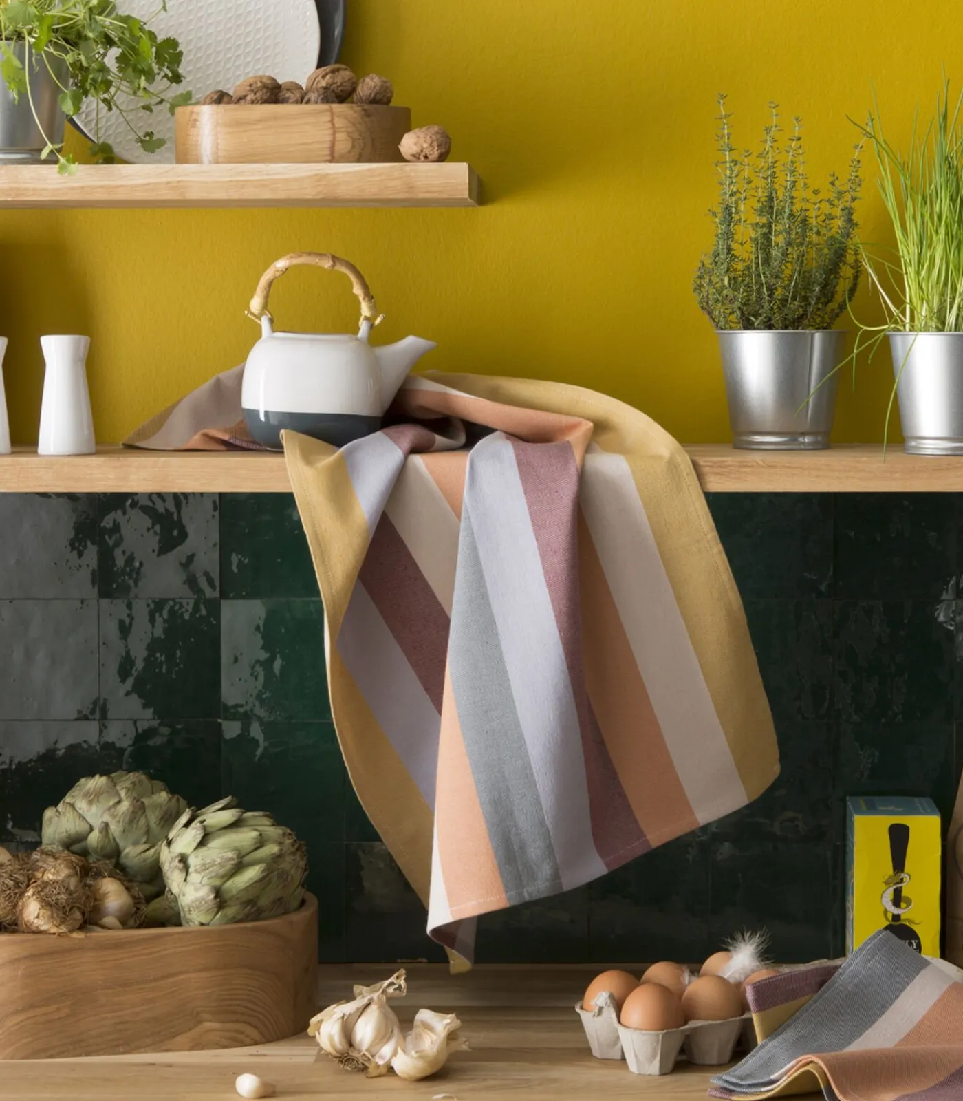 De theedoek Gaspard in katoenen jacquard brengt met zijn kleurenspel een vleugje originaliteit in je keuken