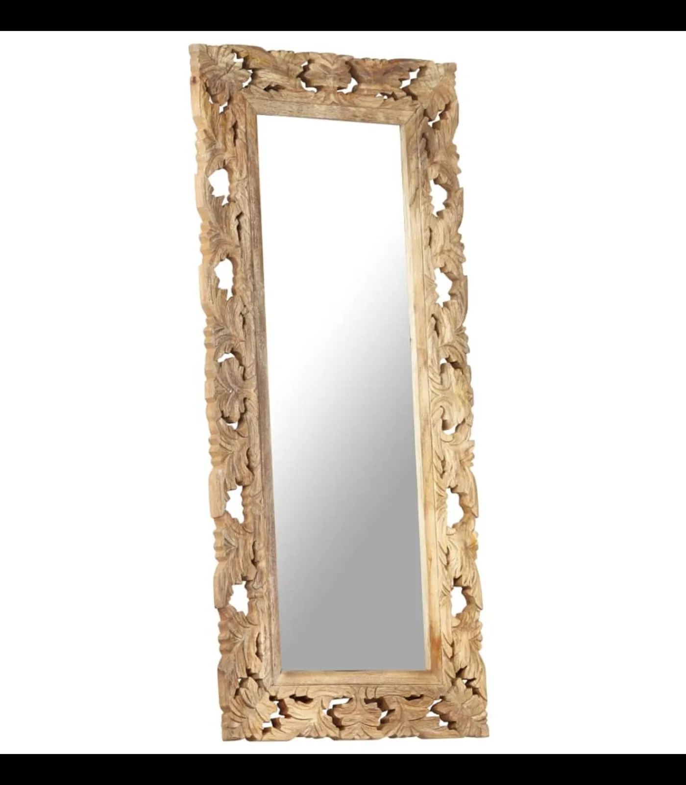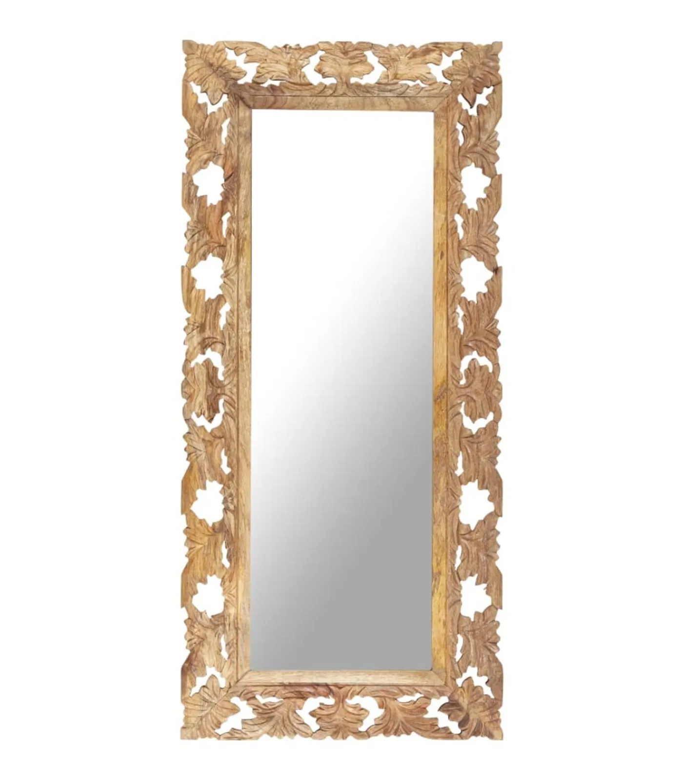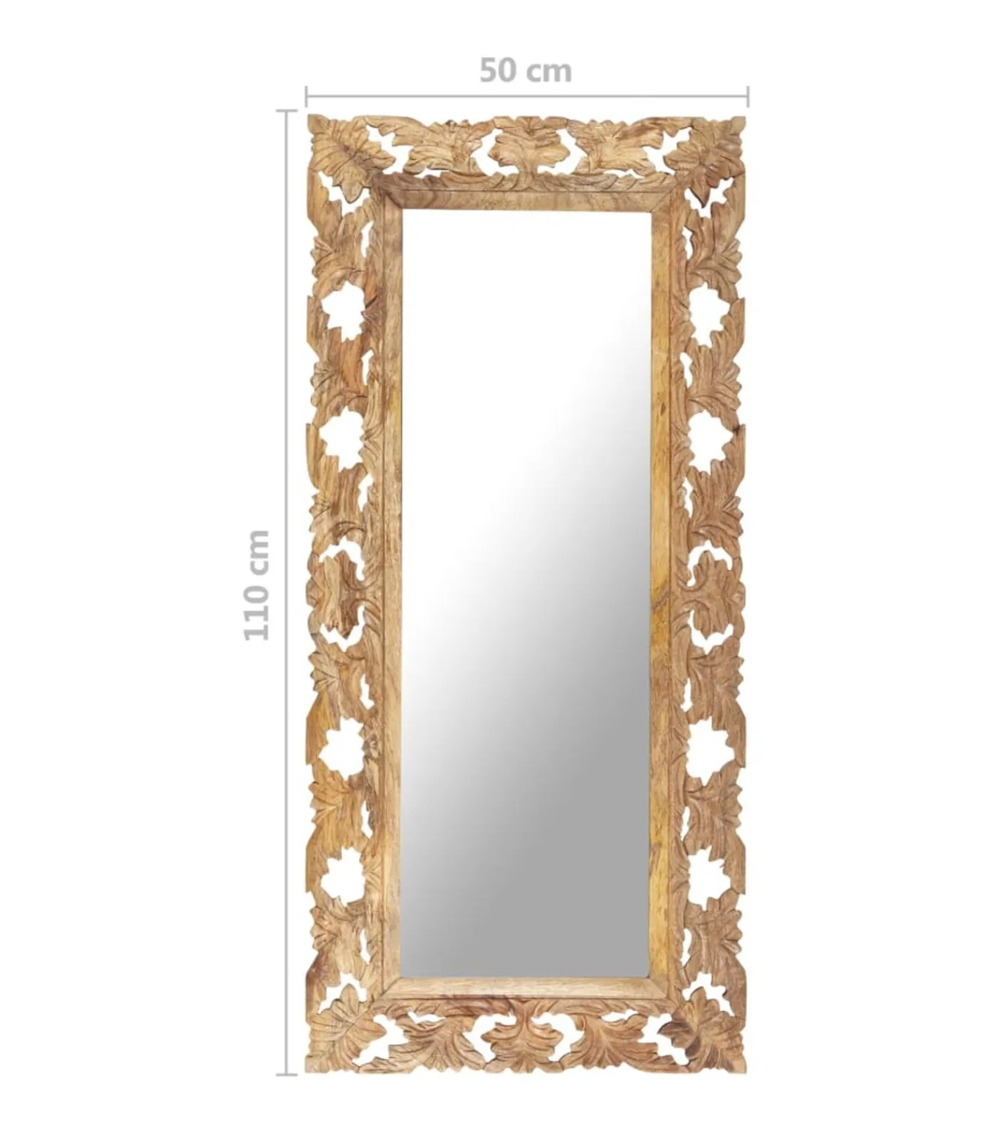 Massief mangohout is een tropisch hardhout. Het heeft de kracht om veel gewicht te dragen en is bestand tegen slijtage. Bovendien zorgen het voortreffelijke vakmanschap en de prachtige houtnerven ervoor dat elke houten spiegel net iets anders is dan de rest. Het met de hand gesneden patroon draagt bij aan de schoonheid.