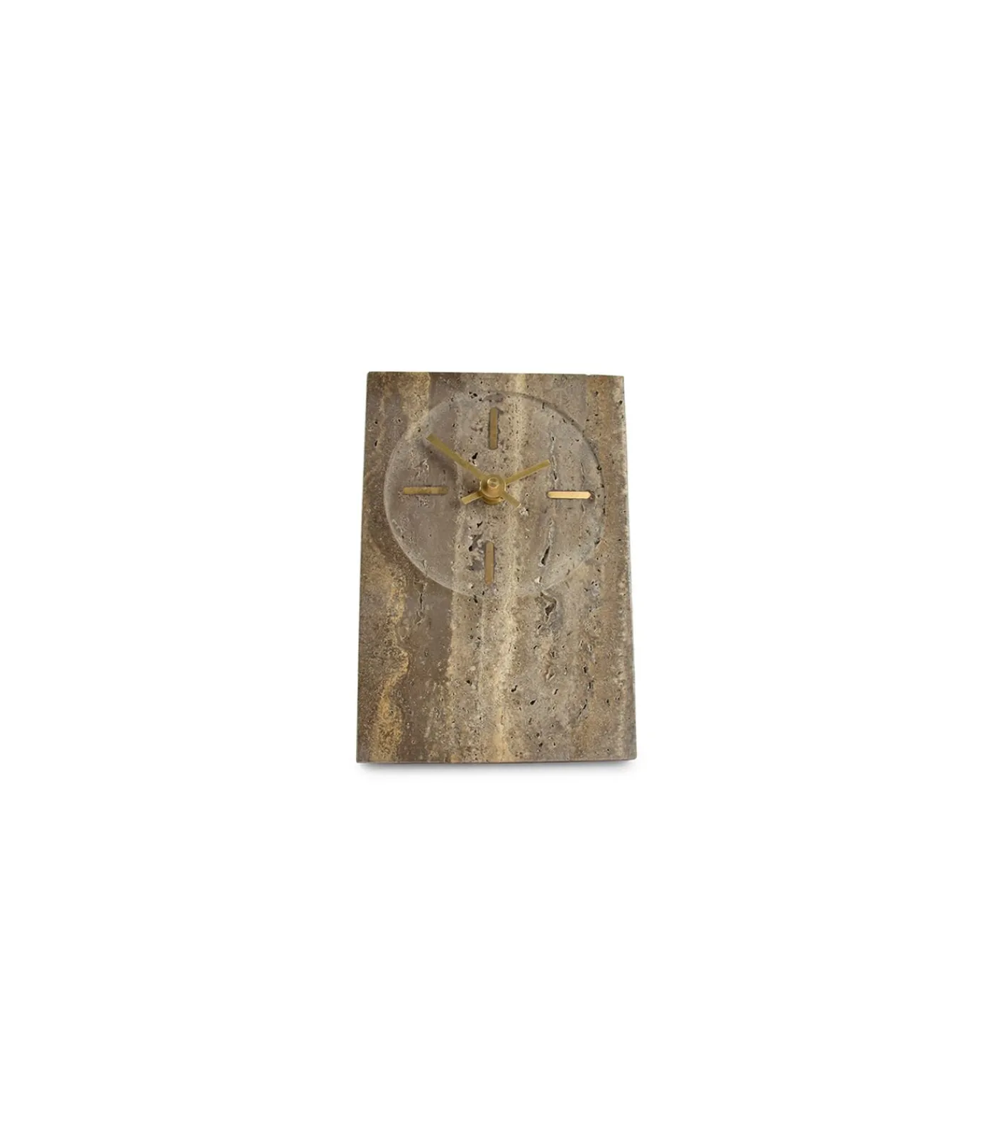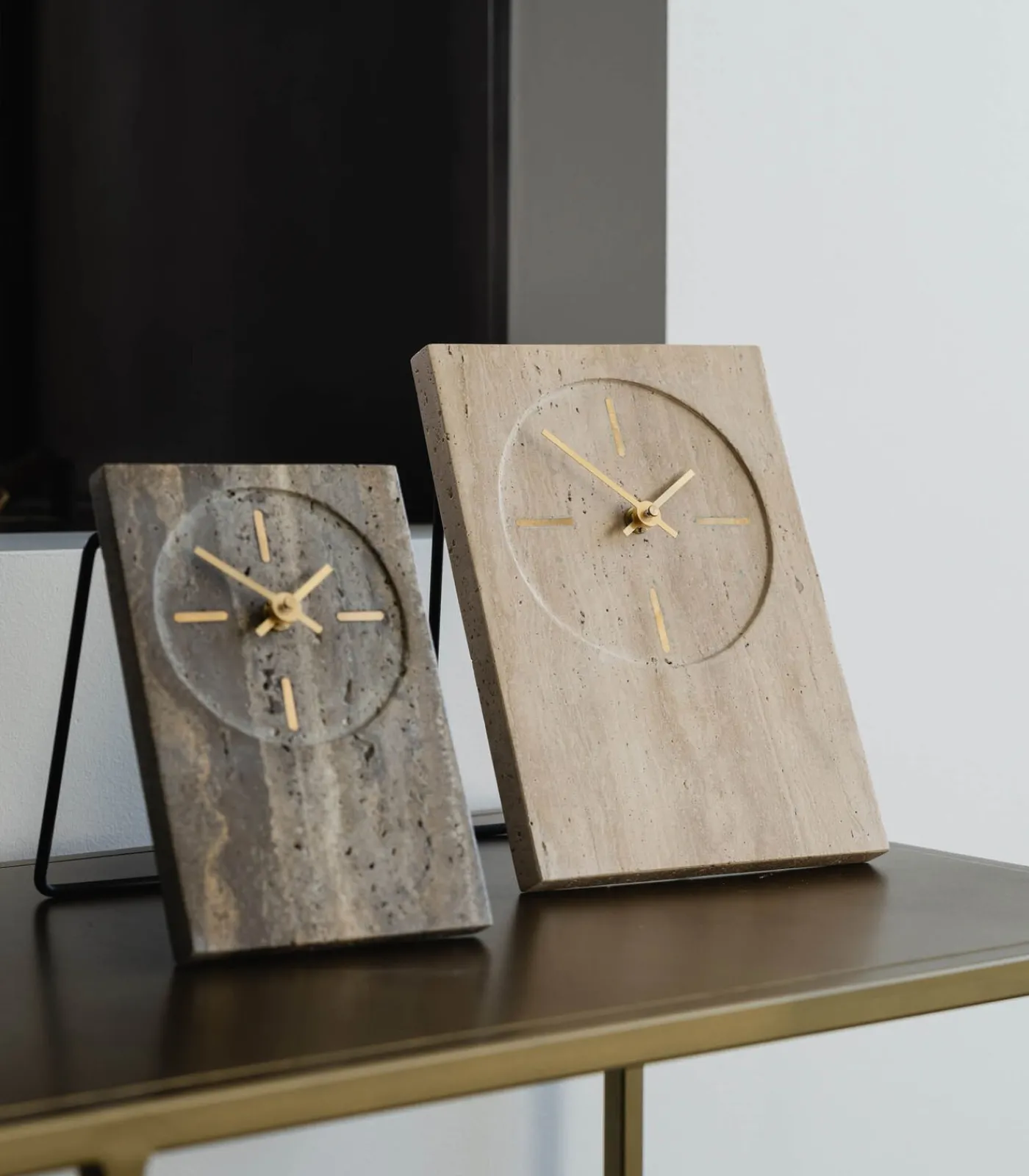 De nieuwe varianten van de Zone collectie zorgen ervoor dat we de tijd nooit meer uit het oog zullen verliezen. Voor deze variant stopten we de klassieke tafelklok in een modern jasje door gebruik te maken van travertijn. De combinatie met de gouden wijzers zorgt voor een fris geheel wat perfect staat in elk interieur. Ontdek hier hoe u de klok kan herstellen als het uurwijzer los zit.