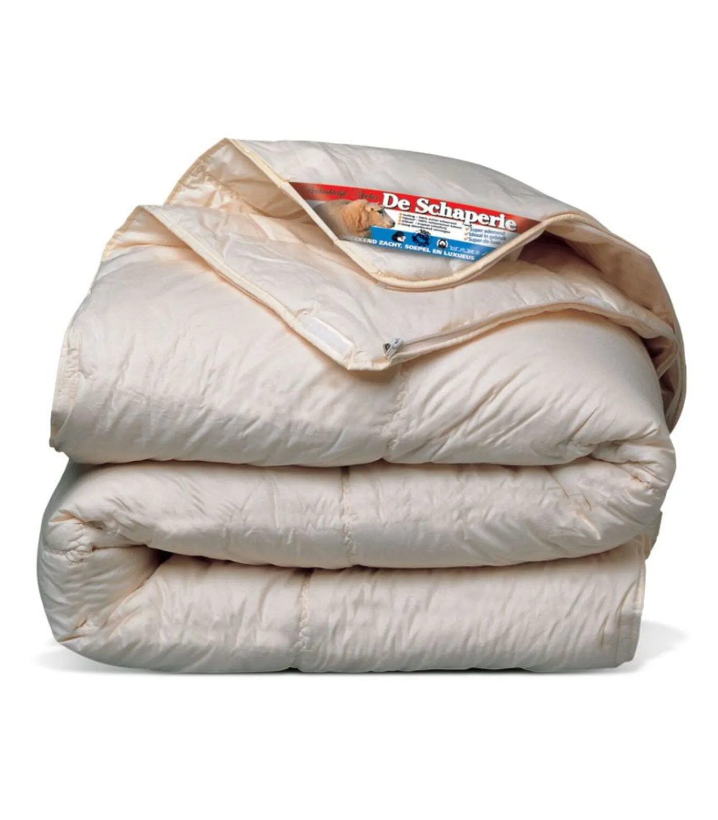 De Schaperie is een 100% zuiver scheerwollen 4–seizoenen dekbed. Puur natuurlijke wol verzorgt ’n perfect gespreide, behaaglijke warmte. Samen met het enorme absorptie en ventilatie vermogen garandeert dit een uiterst gezond en hygiënisch slaapklimaat. Bovendien bevat correct verwerkte wol ’n flinke dosis lanoline(wolvet), wat heilzaam werkt bij gevoelige en pijnlijke spieren en botten.