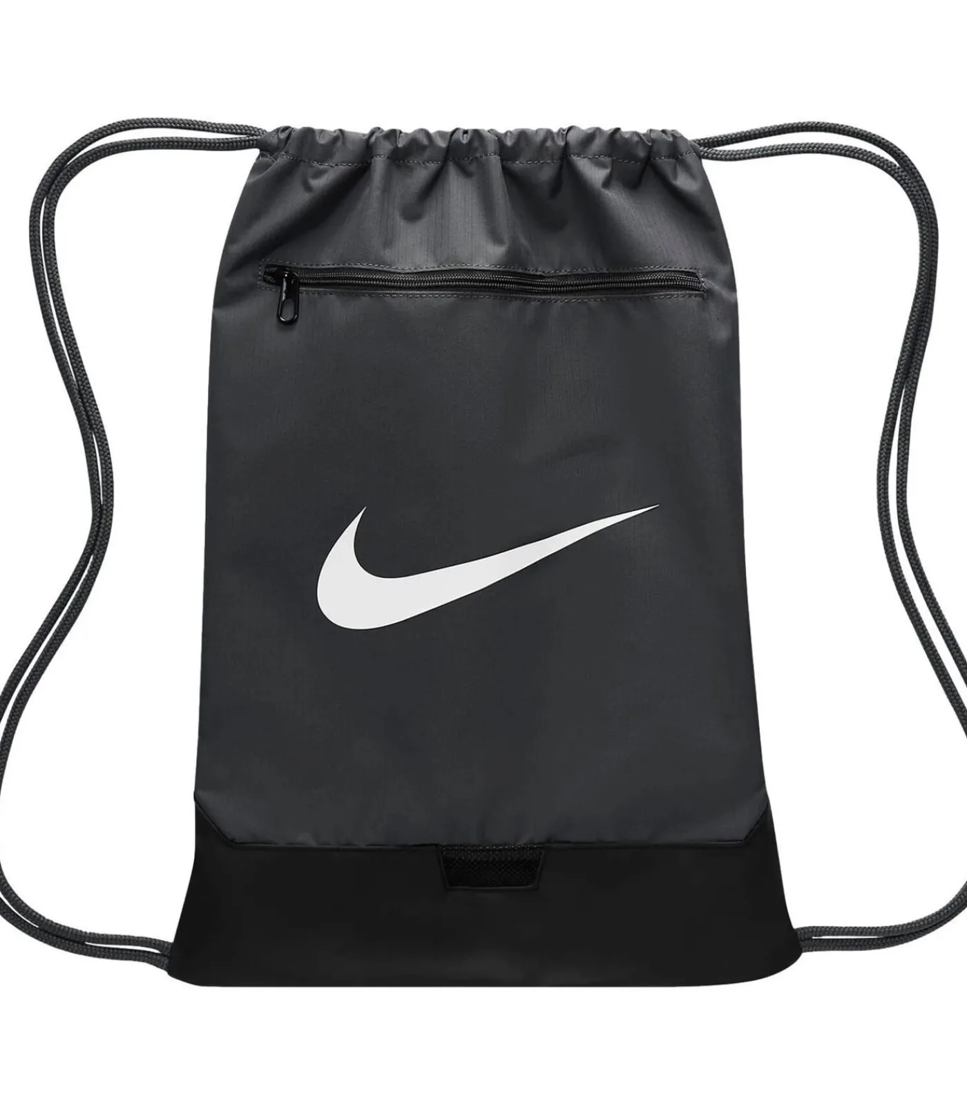 Nike–branded zwarte Brasilia 9.5 schoenentas met een inhoud van 18 liter en een hoogte van 51 centimeter en een lengte van 35,5 centimeter. Dit moederschapsdoek is gemaakt van 100% polyesters, met een diepte van 5 centimeter. Het bezit één voorsak en een ritssluiting. Er is één hoofdcompartiment aanwezig en het doek is voorzien van Ademend– en duurzaamheidsstoffe. Het heeft een tekenkoord om zich vast te bevestigen en een versterkte basis en schouderriem. Het ontwerp bevat de Swoosh–symbool.