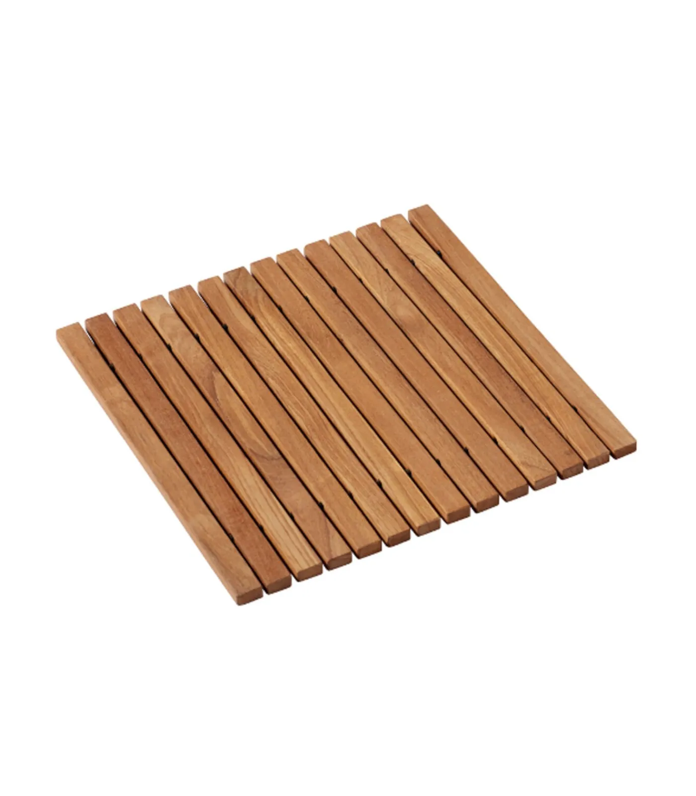 Elegante badmat gemaakt van prachtige teakhouten latten die bij elkaar worden gehouden met zwarte rubberen koorden. De badmat wordt gekenmerkt door een mooie speling in het hout en kan bijvoorbeeld voor de wastafel, het bad of de douche worden gelegd. Let op: De badmat mag niet in het water liggen, want de kleur van het teakhout kan verkleuren als de onderkant permanent nat is. Zorg er daarom voor dat er geen water onder de mat stroomt en blijft liggen. Waterdruppels bij het drogen zijn echter geen probleem.
