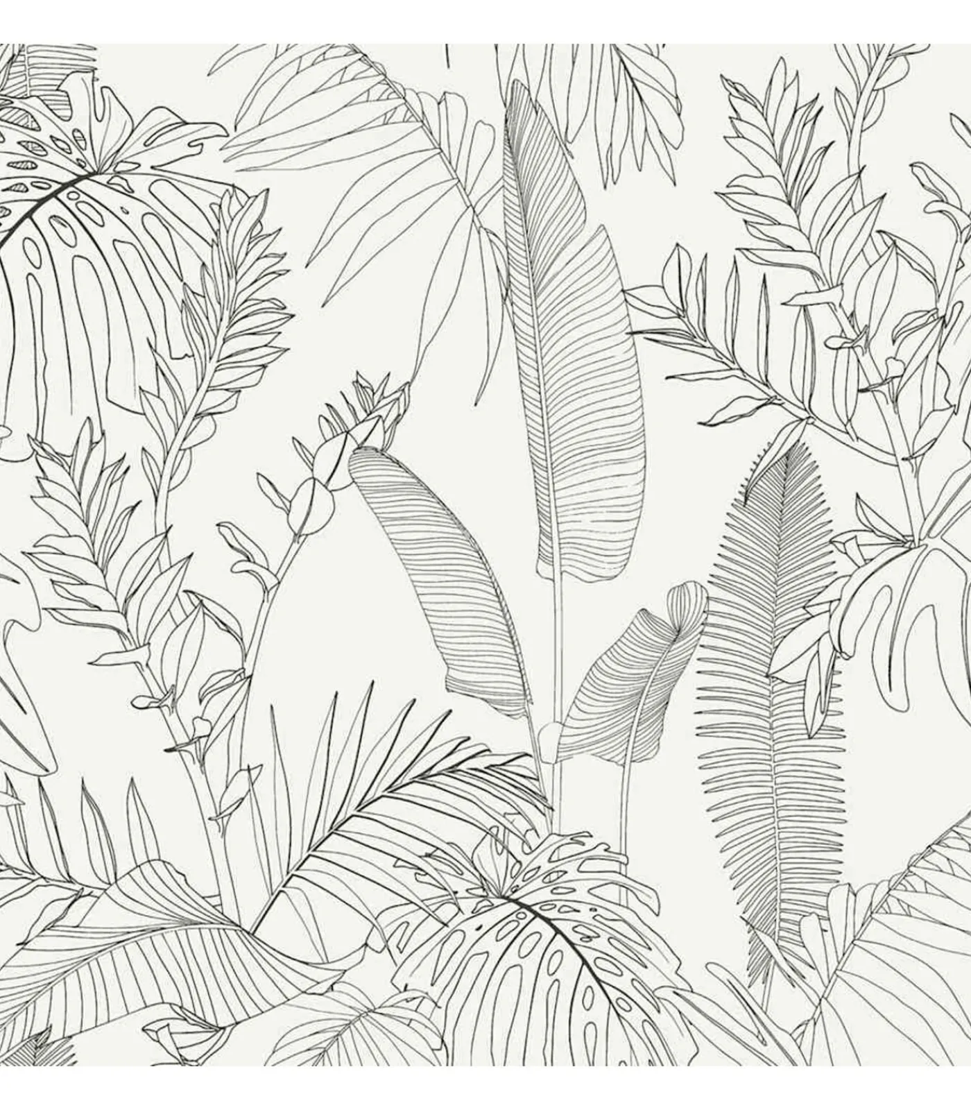 Exquise design: Het behang heeft een delicaat en modern tropisch design met handgetekende bladeren in het zwart op een zachte witte achtergrond. De minimalistische lijnkunst legt de essentie van weelderig tropisch gebladerte vast, terwijl het een schone, verfijnde look behoudt.