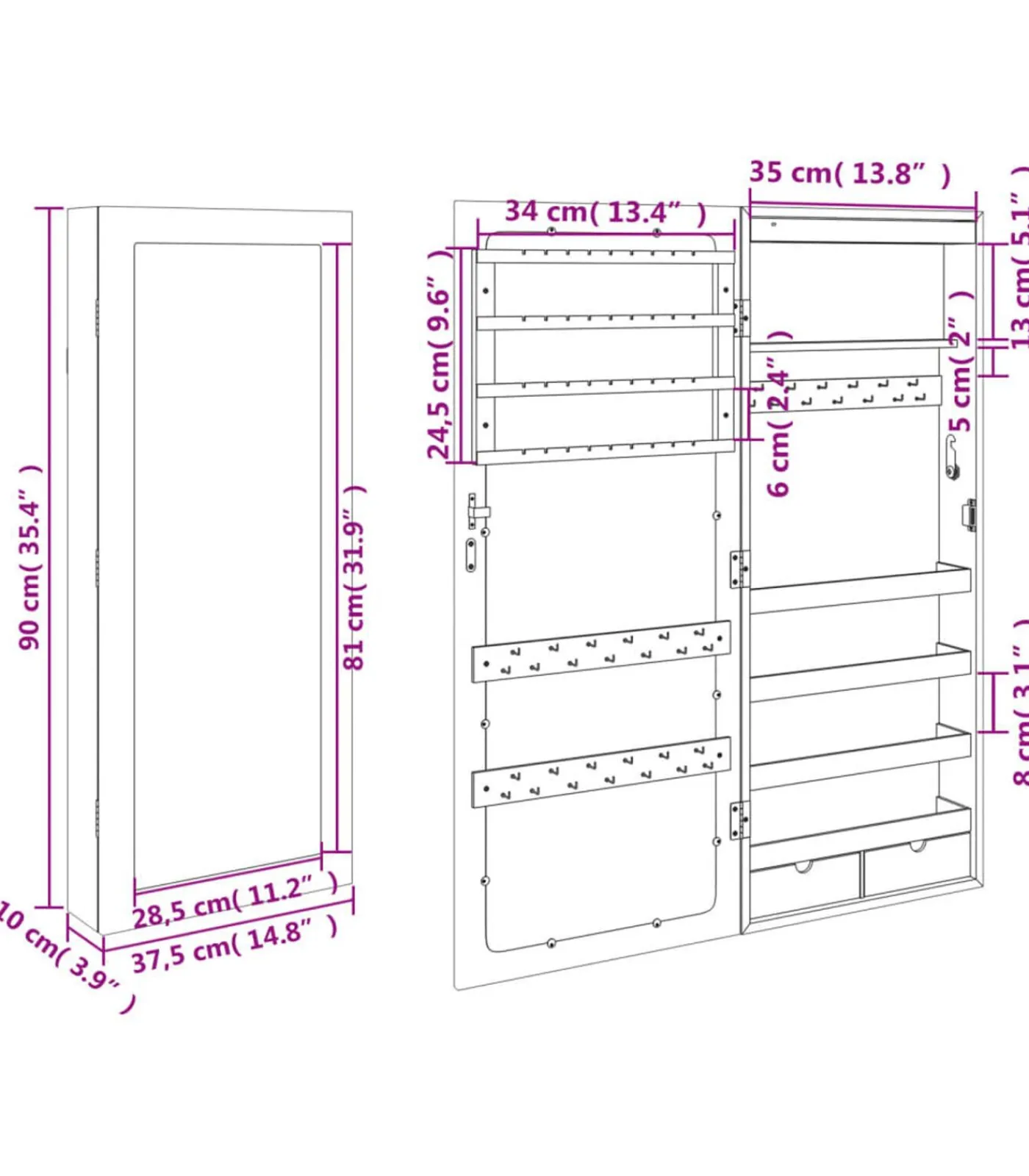 Handige LED–verlichting: de LED–verlichting bevindt zich bovenaan aan de binnenkant en gaat automatisch aan wanneer de deur opengaat, zodat je je sieraden kunt vinden.