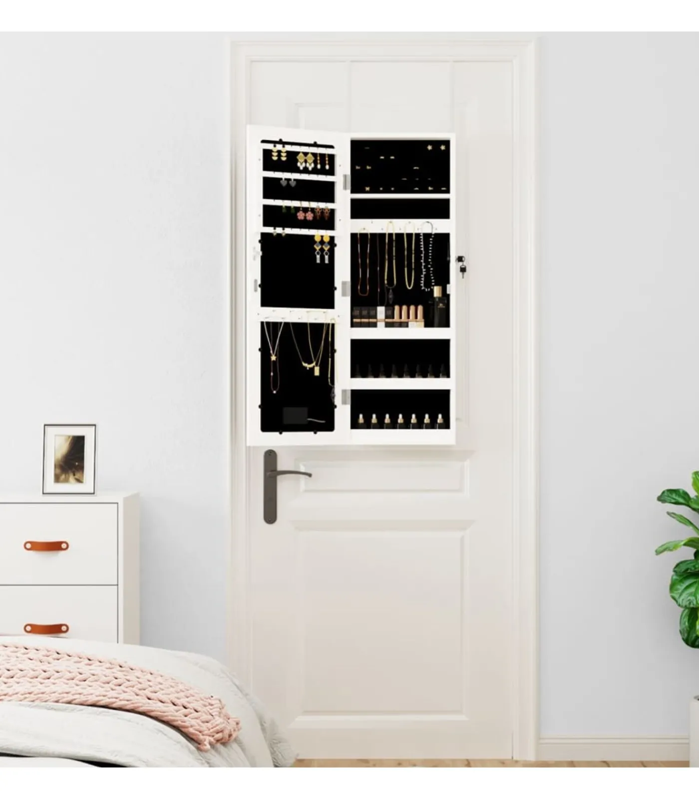 Voldoende opbergruimte: de spiegel met opbergruimte heeft veel haakjes, hangers en plankjes om je sieraden netjes geordend en binnen handbereik te houden.