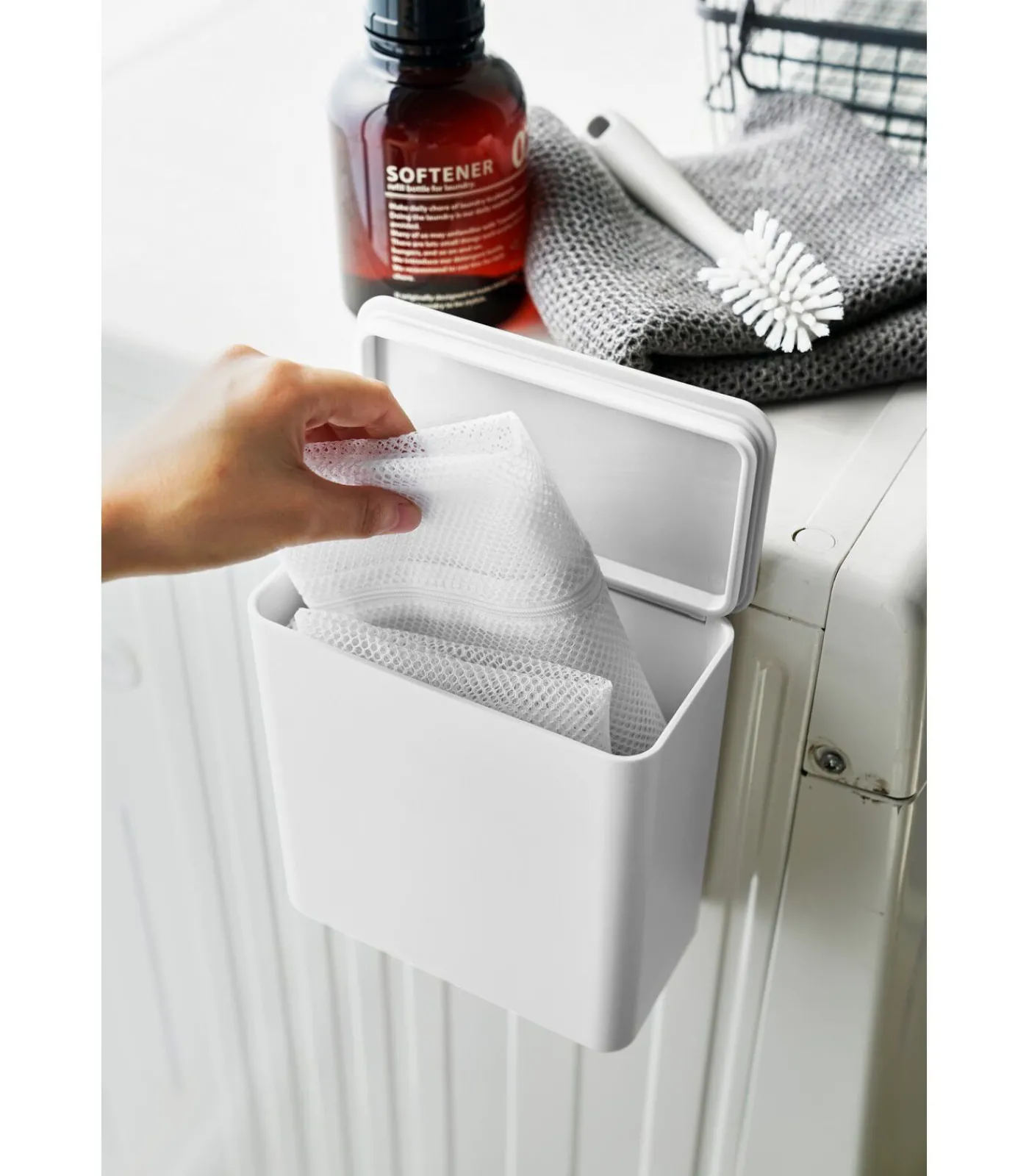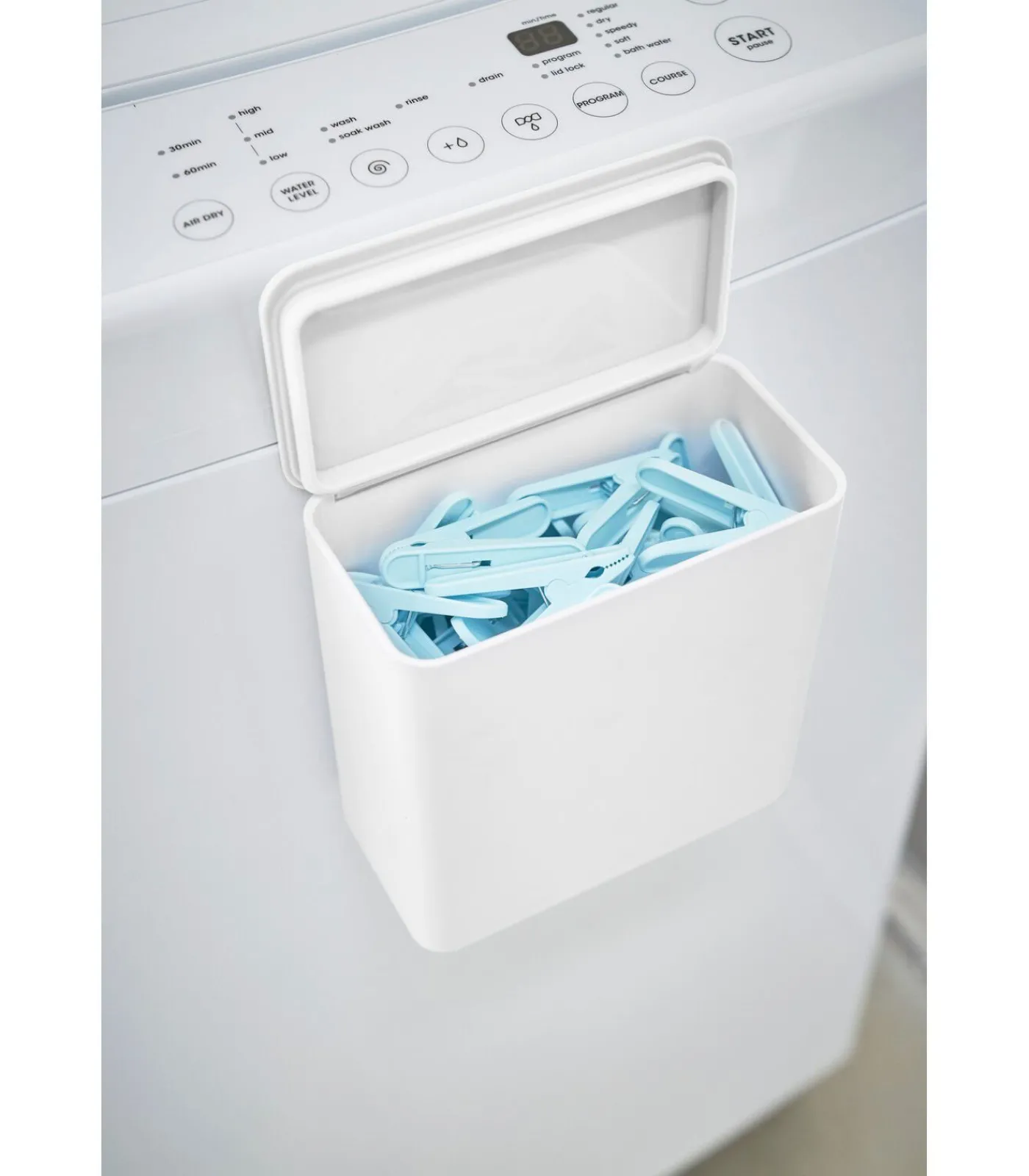 Deze magnetische opbergbak van Yamazaki is eenvoudig te bevestigen aan een wasmachine of ander metalen oppervlak. Daarnaast kan de bak ook rechtop worden geplaatst op een wastafel of kastje. Door de afsluitbare deksel blijft de inhoud netjes en stofvrij. Ideaal voor het opbergen van wasmiddel, wasknijpers en andere wasbenodigdheden.