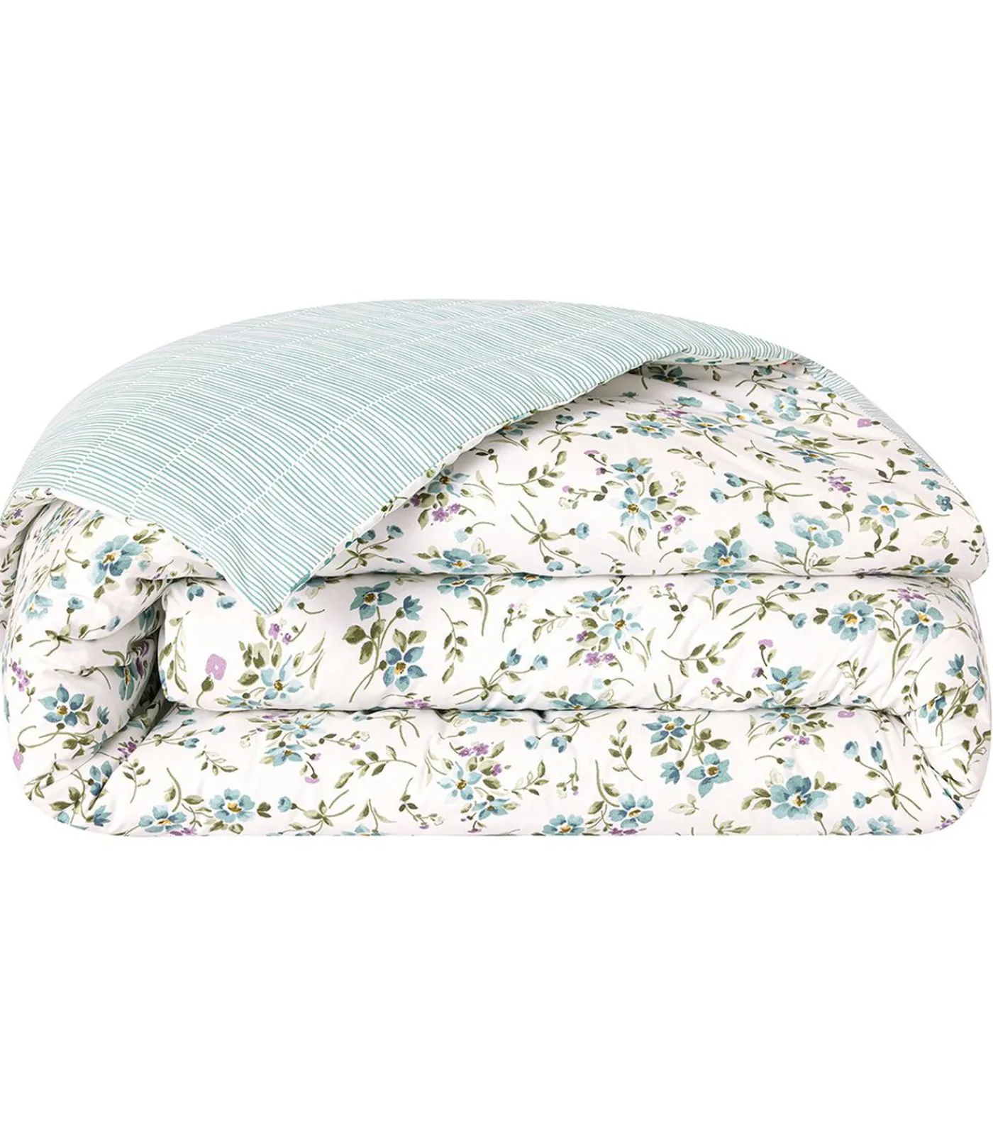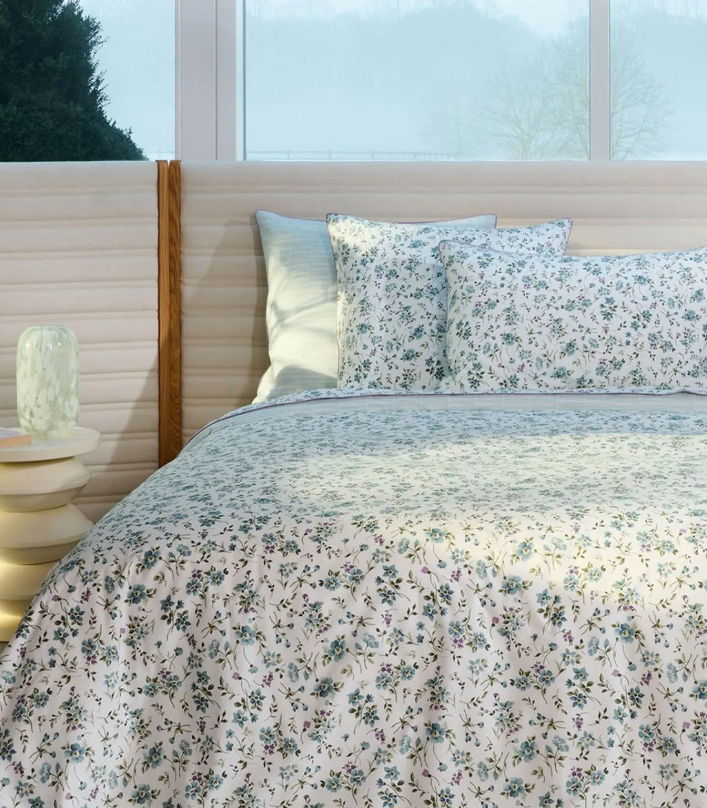 Print van viooltjes in blauwtinten en paars op ivoorkleurige achtergrondPrint van kleine horizontale blauwgroene strepen op ivoorkleurige achtergrond