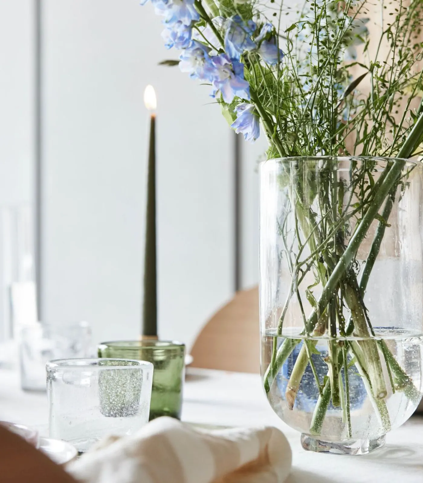 De glazen Kuki–vaas heeft bubbels die een vleugje eigenzinnigheid toevoegen aan het minimalistische ontwerp. De strakke vorm voegt een speels element toe aan de tijdloze esthetiek en combineert functionaliteit met elegantie. Perfect om bloemen in te zetten of als los decoratief stuk. Omdat elke vaas mondgeblazen is, varieert de grootte, wat bijdraagt aan zijn unieke charme.