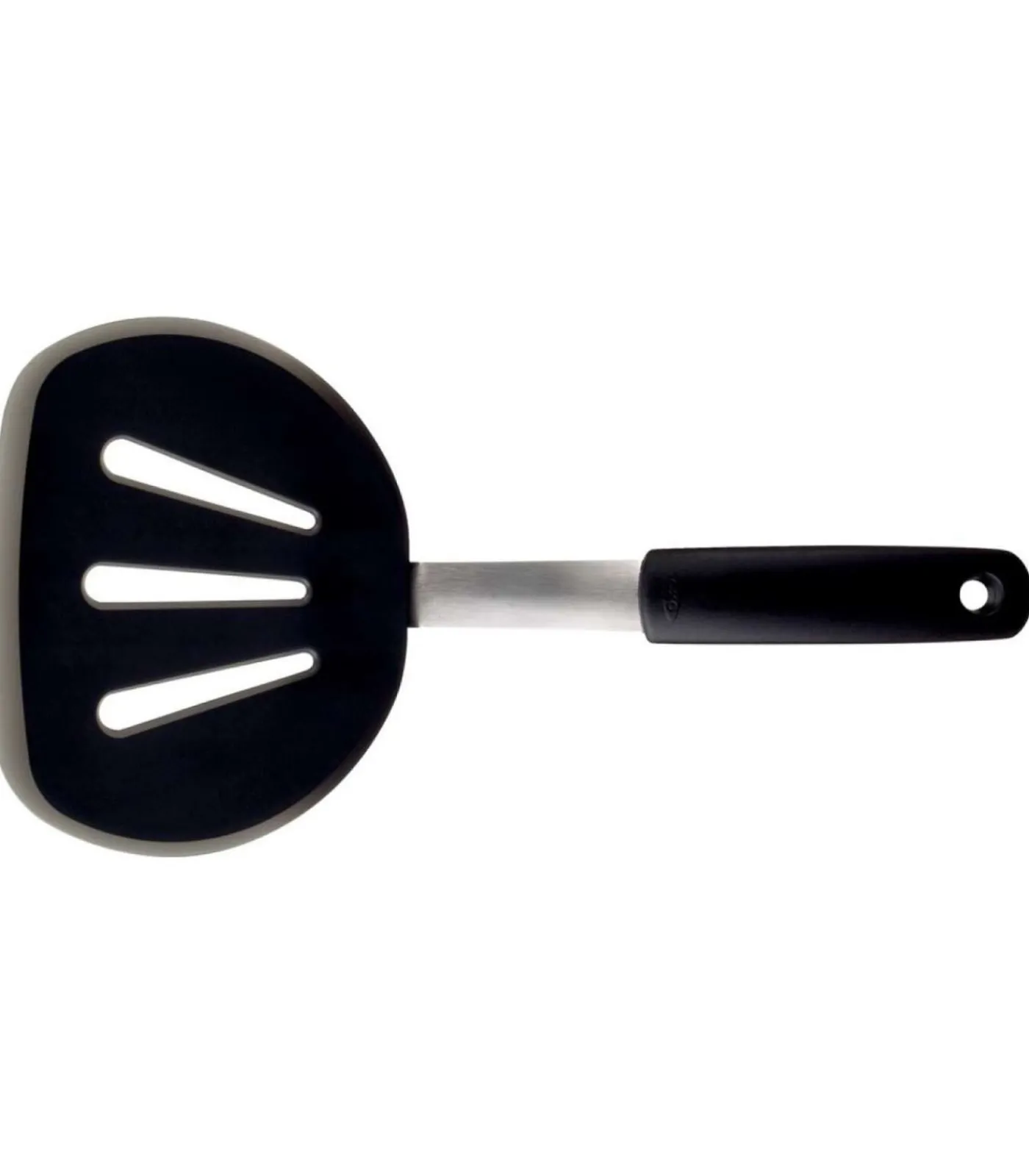 De OXO pannenkoekspatel heeft een dunne, flexibele rand die gemakkelijk onder een pannenkoek glijdt. Ook is het perfect voor het draaien van hamburgers, eieren en veel meer. De spatel heeft gleuven waar het vet eventueel door kan druipen. De combinatie van roestvrij staal en flexibel siliconen maken de OXO Pannenkoekspatel niet alleen sterk, maar ook fijn om mee te werken. De spatel heeft een anti–kleef buitenlaag die hittebestendig is tot 300°C. Ook is de spatel vaatwasserbestendig en makkelijk op te bergen door het gaatje aan de onderkant van de spatel.