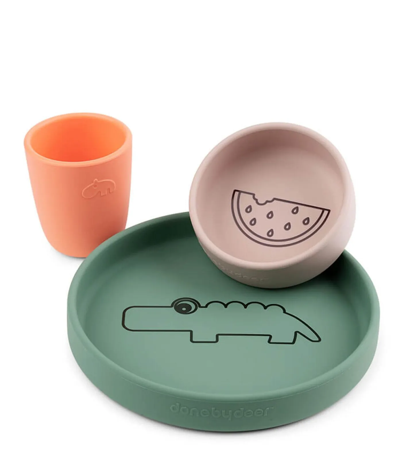 Done by Deer Silicone Dinner Set Croco Colour MixDe Done by Deer Silicone Dinner Set Croco Colour Mix is perfect voor kleine avonturiers aan de eettafel. Deze leuke en praktische set bestaat uit een bord, kom, beker en bestek, allemaal gemaakt van hoogwaardig siliconen materiaal. Het kleurrijke ontwerp met schattige krokodilprint zal zeker de aandacht van je kind trekken en het etenstijd leuker maken.Het siliconen materiaal is zacht, flexibel en gemakkelijk schoon te maken. Het is ook BPA–vrij en veilig voor gebruik in de magnetron en vaatwasser. De antislip bodem zorgt ervoor dat de set stevig op tafel blijft staan, zelfs als je kleintje enthousiast aan het eten is.Met de Done by Deer Silicone Dinner Set Croco Colour Mix kan je kind genieten van zijn maaltijden in stijl en comfort. Het is een geweldige toevoeging aan elke kinderserviescollectie.Aanvullende productinformatieGemaakt van siliconenInclusief dinerbord, kom, beker en bestekMet krokodillenprintGeschikt voor kinderen