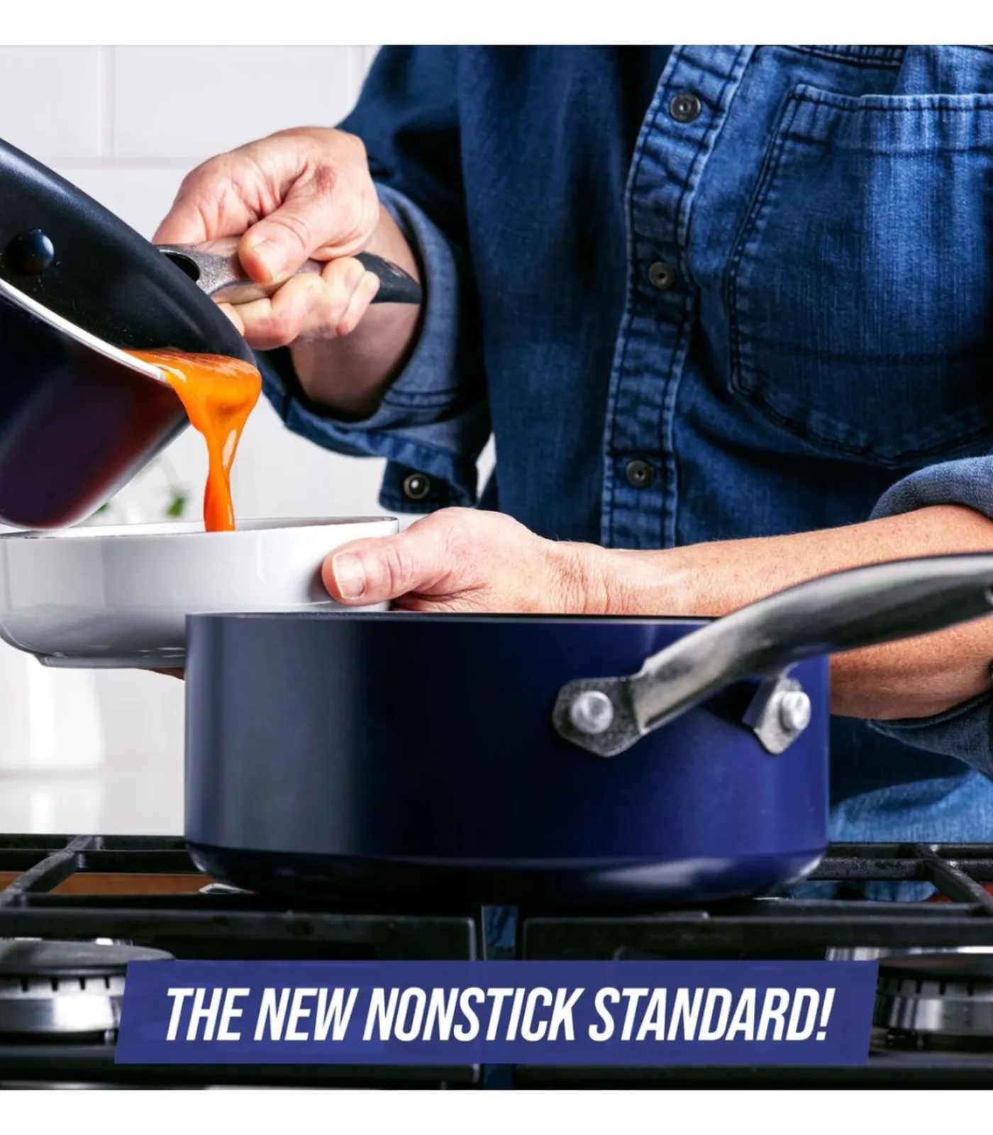 Deze steelpannenset van [manufacturer] is gemaakt van [materiaal]. De steelpannenset is blauw en zilver van kleur en heeft een keramische anti–aanbaklaag. De harde coating is extra hard en daardoor zijn ze beter beschermd tegen krassen dan andere pannen. De handgrepen van de pannen liggen lekker in de hand en hebben een goede grip. De pannen mogen in de oven en zijn vrij van de stoffen PFAS, PFOA, lood en cadmium. Je kan deze pannen ook gebruiken op gas, elektrisch, halogeen of keramisch en na gebruik kan deze steelpannenset in de vaatwasser.