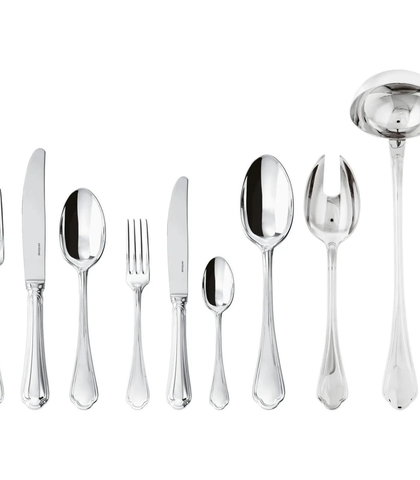 Set Bestaande uit: 12 tafellepels, 12 tafelvorken, 12 tafelmessen, 12 dessertvorken, 12 dessertmessen, 12 theelepels, 1 opscheplepel, 1 opschepvork, 1 opscheplepel