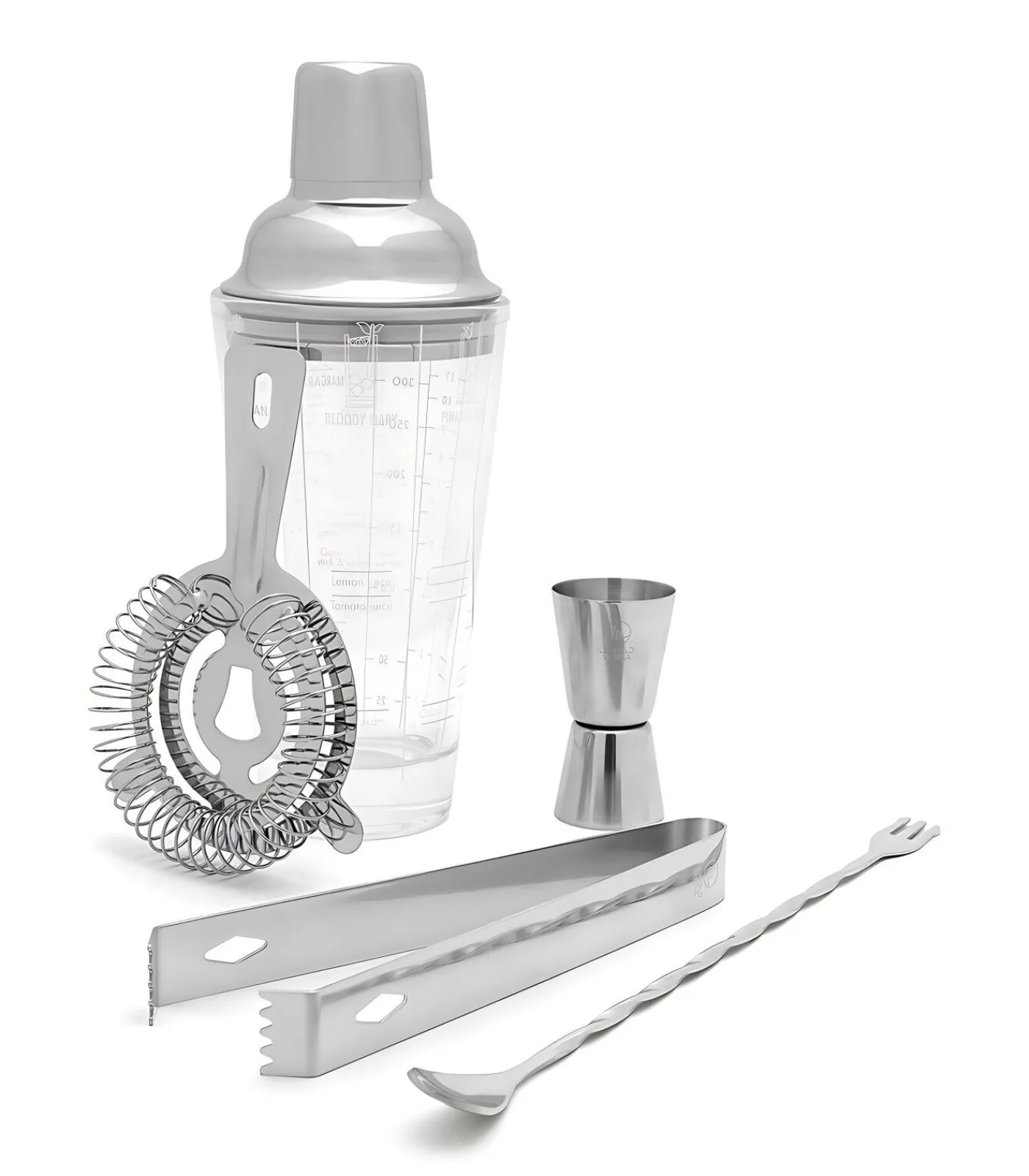 Zelf cocktails maken? Deze set heeft alles wat je nodig hebt. Hij is voorzien van een glazen shaker, een barmaat, een strainer, een tang voor ijsblokjes en een gecombineerde vork/lepel. Handig zijn de recepten die op de shaker vermeld staan. Volop inspiratie voor een cocktailparty thuis! In fraaie geschenkverpakking.